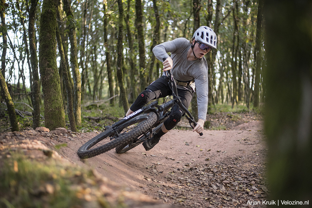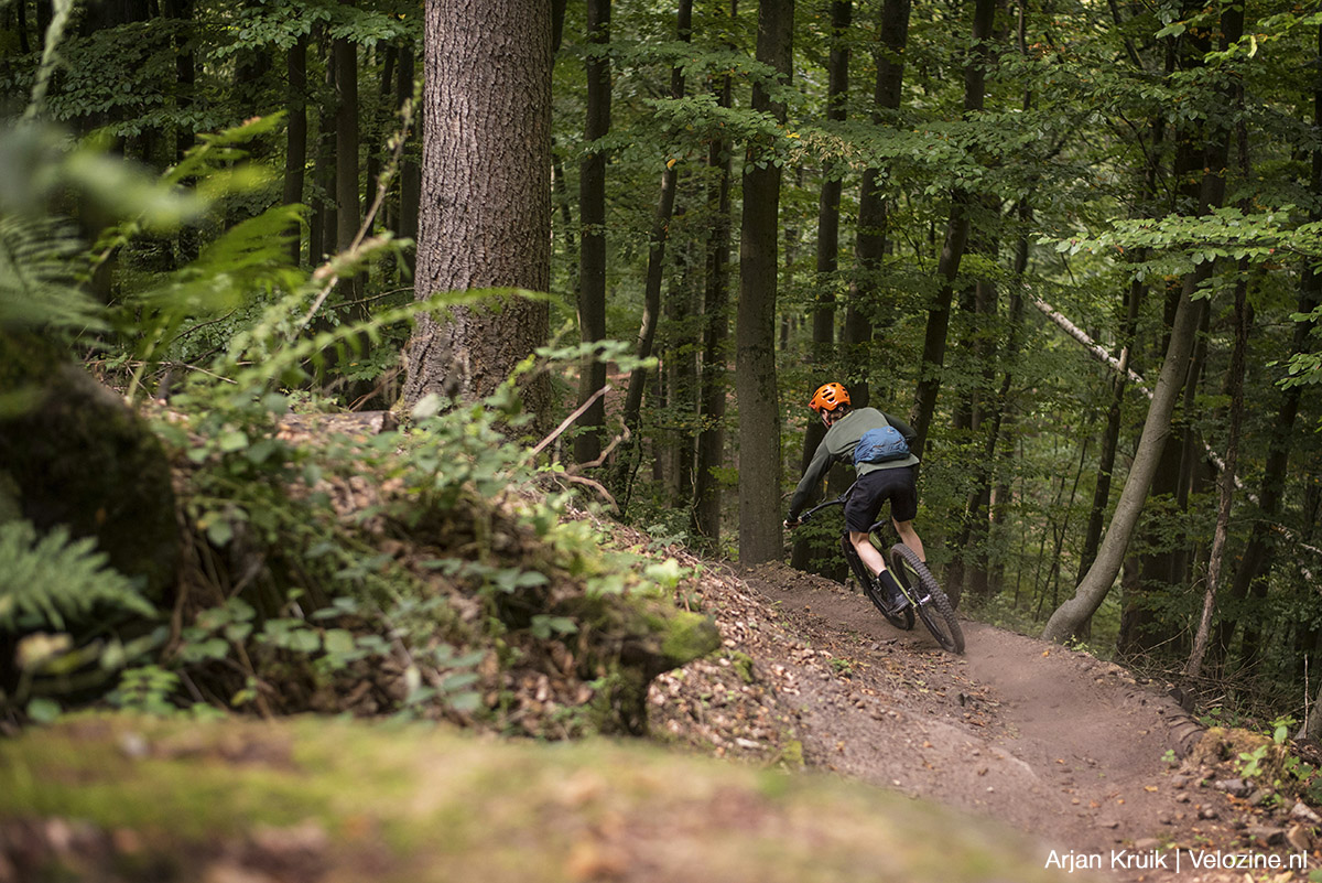 Maar er is nog een ander verschil, zo blijkt bij de eerste run: de ondergrond bestaat hier niet uit zandsteen, maar uit leem. Als het regent is gaat deze trail dan ook resoluut dicht, dan valt er niet te fietsen. Maar als het zoals nu droog is, dan is die leem zo hard als beton. En dat geeft ten opzichte van de trails van Saarbrücken’s Finest een totaal andere rijervaring. Het doet mij het meest denken aan een pumptrack, maar dan eentje die naar beneden loopt. De trail is echt supersnel, maar dat voelt vanwege de immense grip die de ondergrond biedt eigenlijk veel minder eng aan dan je zou verwachten.