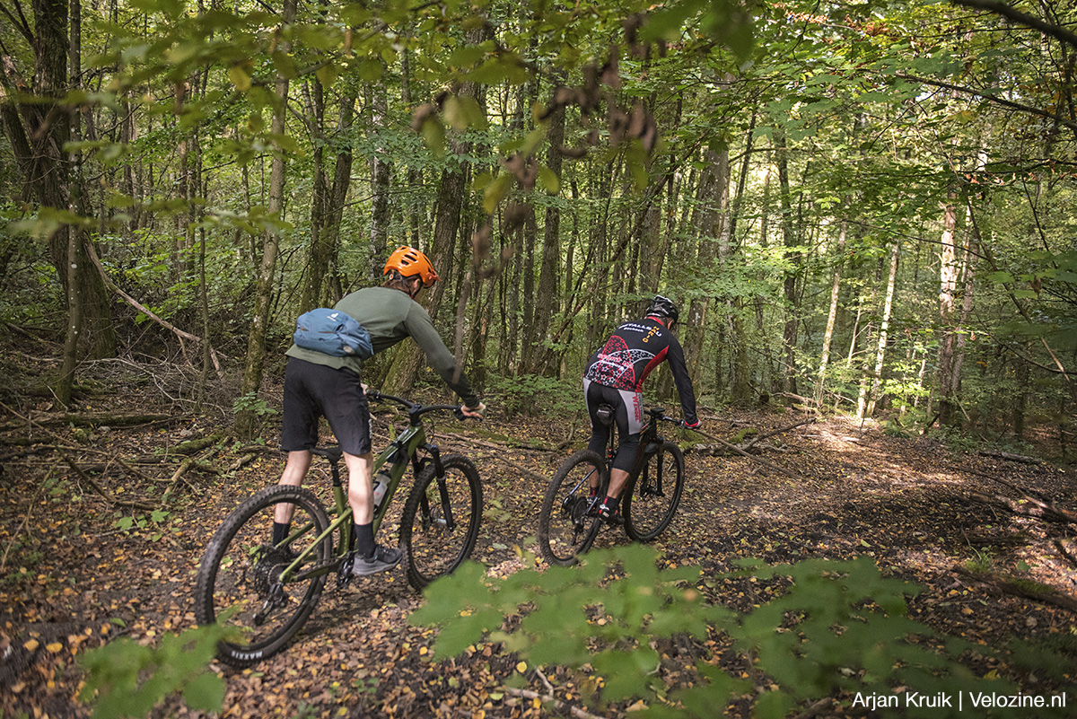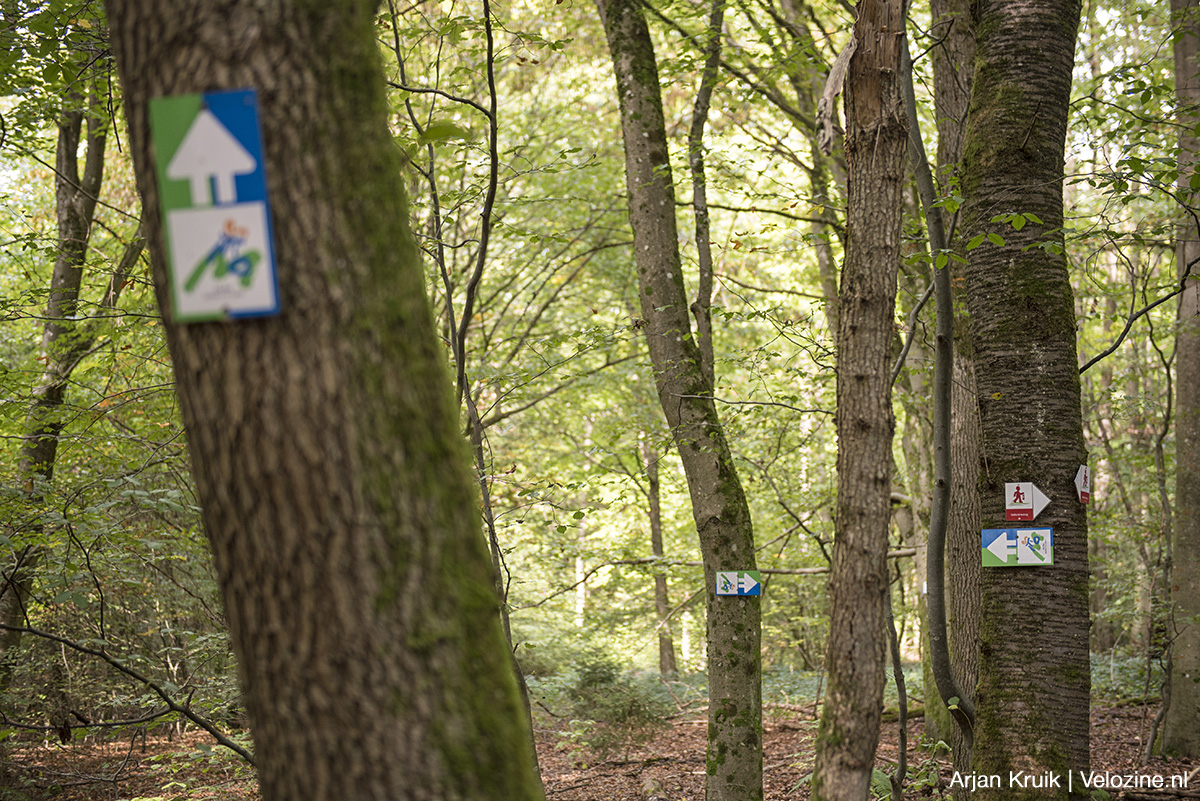 “Nee, we hebben niks gegraven of gebouwd, de complete route maakt gebruik van bestaande wegen en paden”, vertelt hij over zijn parkoers “Ik ben er echt maanden mee bezig geweest om de juiste paden met elkaar te verbinden. Nu is het vooral zaak om de boel goed te onderhouden. Ik check iedere week of de bordjes er nog hangen, of er geen bomen op het pad liggen, of er niks is weggespoeld. Vooral aan de bordjes heb ik veel werk. Op sommige plekken werden ze steeds door wandelaars weggehaald. Op een gegeven moment ben ik maar met een ladder het bos in gegaan. Nu hangen die bordjes zo hoog, dat niemand er meer bij kan. Nadeel is dat ze ook niet meer zo goed zichtbaar zijn…” Valt enorm mee, vind ik, zeker als je eenmaal weet dat sommige routebordjes wat hoger kunnen hangen dan je verwacht. Props voor Michael, want verkeerd rijden is hier echt onmogelijk.