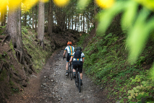 Dag twee, etappe twee van de Gravelbike Experience. Een relatief korte etappe, met volgens de briefing veel hoogtemeters, maar zeer weinig gravel. Een verkapte wegrit dus? De gevoelde realiteit blijkt totaal het tegenovergestelde. Want dit wordt, naar mijn mening, de leukste dag bij deze meerdaagse graveltocht door de Alpen! Direct vanaf de start duiken we een lange, snelle double track bosafdaling in richting het Inntal. Onze gids Andreas heeft er duidelijk zin in vandaag: hij geeft serieus gas. Ik duik onderin de beugel, spring in zijn wiel, besluit hem te vertrouwen en probeer hem te volgen. Dat lukt… nét. Andreas lacht enigszins verbaasd, als hij 600 hoogtemeters lager aangekomen omkijkt. Wát een lekker begin van de dag. Spaß machen!