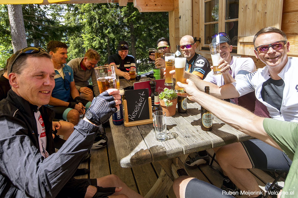 Twee kilo zwaarder dan daarvoor raggen we vervolgens extra hard naar beneden, om daarna direct de gravelklim richting de Ehrwalder Alm op te draaien. Met 2,5 kilometer lengte en 240 hoogtemeters is die beklimming niet direct lang of hoog. Maar wie even rekent komt wél uit op een gemiddeld percentage van 13,6 procent! Boven aangekomen beschrijven velen het gevoel “dat de knödels sneller hoogtemeters maakten dan zijzelf”…