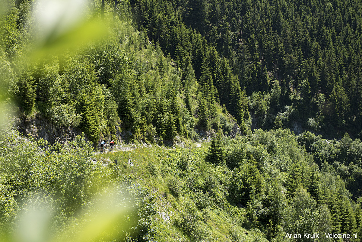 Met heel wat minder pk’s dan de vierwielers die Ferry Porsche ontwierp, trappen wij onze tweewielers verder. Na Thumersbach is het gedaan met ontspannen pedaleren. We moeten omhoog de Erlhofplatte op, van 750 meter hoogte naar 1.500 meter, met stijgingspercentages die niet of nauwelijks onder de tien procent zakken. Met name de eerste helft van de klim, die over asfalt loopt, is gemeen steil. Vooral Frank heeft het zwaar. Zijn 1×12-speed Koga Colmaro heeft een dik 46-tands voorblad. Niks mis mee in Nederland, maar in de bergen trap je je met zo’n ding echt het apezuur. Hij is er dan ook helemaal niet rouwig om als de klim op driekwart wat afvlakt.