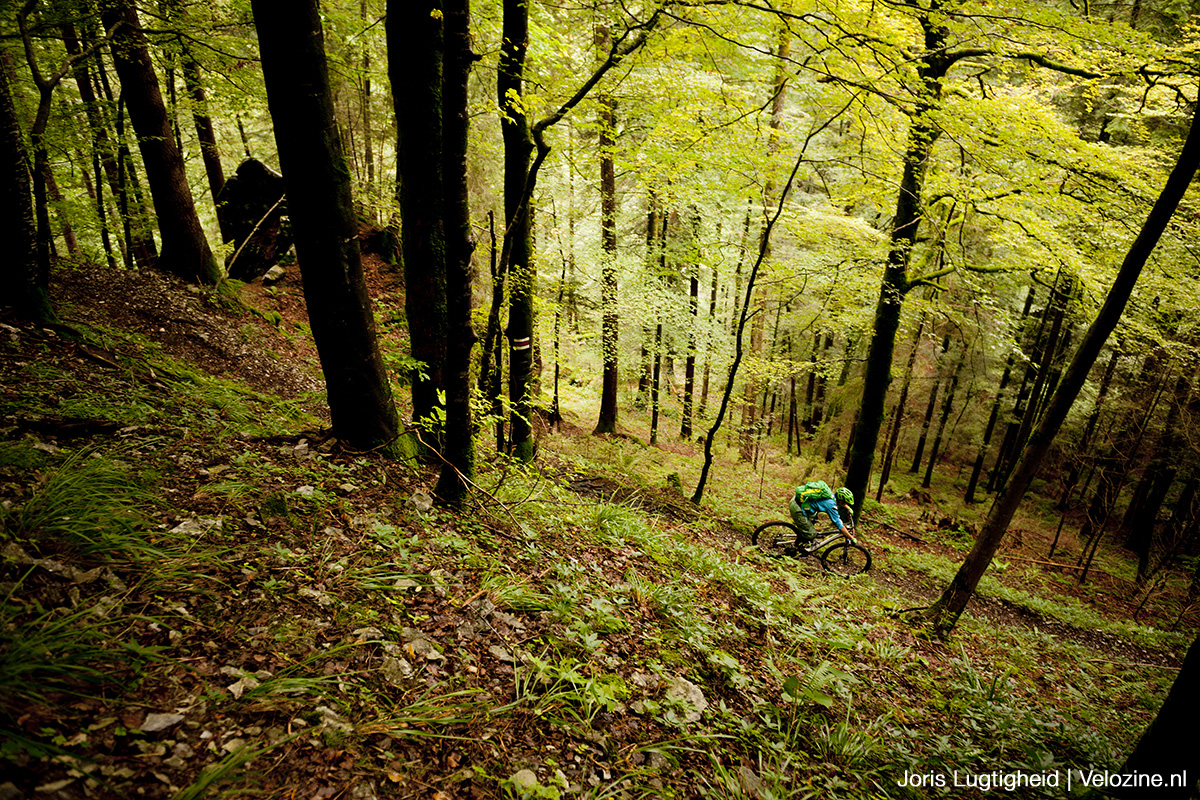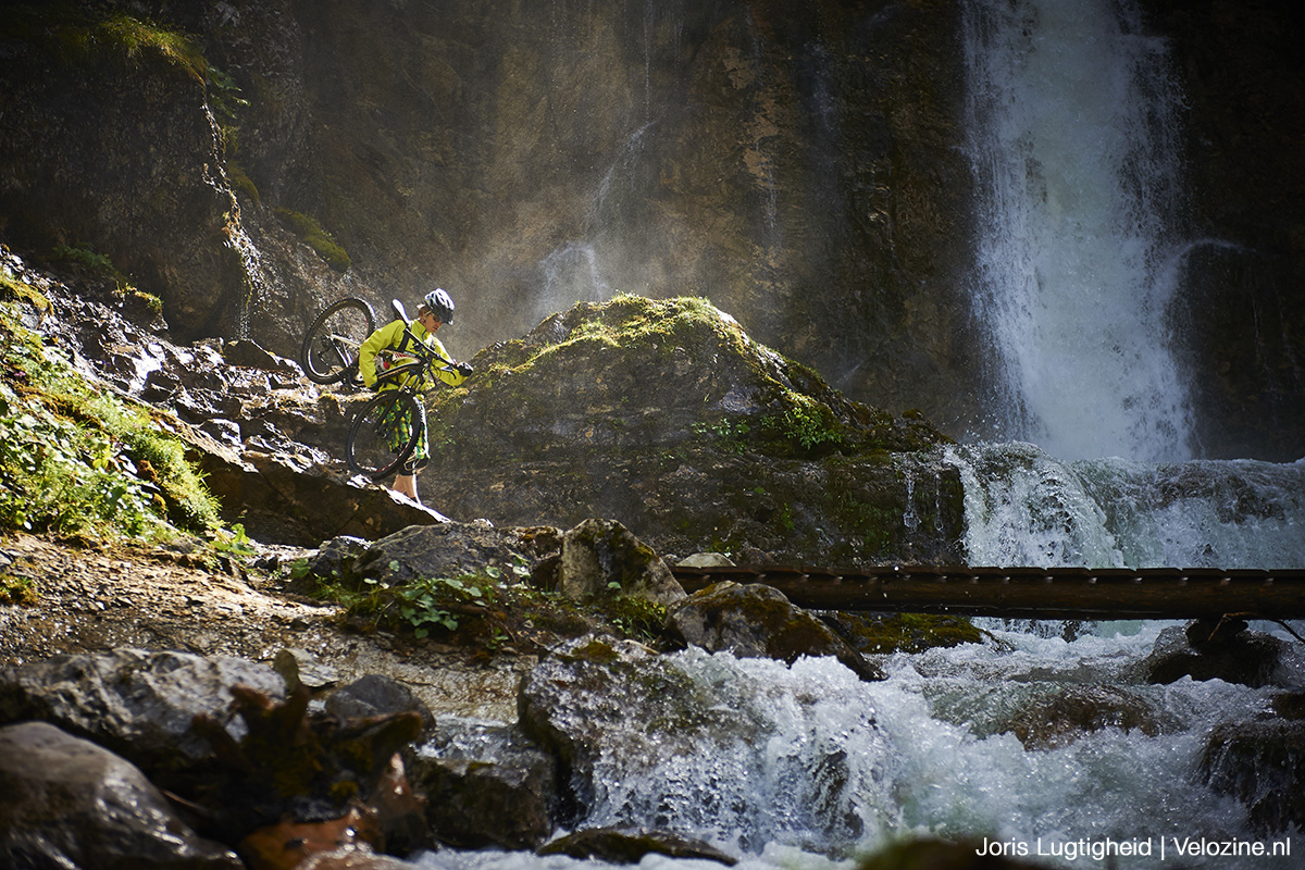 Toch zijn wij blij met de Transporter, want na de overdadige lunch rijden we richting Bezau, een dorpje tien kilometer westelijker. De route daar is volgens Johannes “ein geheimtipp”. Reden: Johannes heeft de trail tijdens exploratietochten in de omgeving zelf ontdekt. Wat er zo bijzonder aan is zien we al snel. We rijden over een bosweg de bergen in, nemen vervolgens een smal wandelpad met een paar steile looppassages en staan dan plotseling onder een metershoge, loodrechte en op vele plekken zelfs overhangende kalksteenwand. Met onder die wand een pad. Spectaculair! En vooral ook: goed fietsbaar. Alhoewel… de natte wortels zijn best listig. En dat wordt erger als we na een meter of achthonderd weer bij de wand wegrijden, het bos in. Maar uiteindelijk rollen we, vele haarspeldbochten lager, toch heelhuids het bos uit.