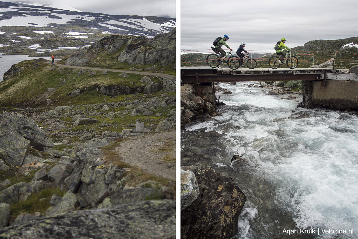 Na Haugostøl laat je de wereld van autoverkeer achter je. De Rallarvegen is voor het overgrote deel exclusief voor fietsers. Het pad slingert mee met de kronkelende spoorlijn en kruist die af en toe. Al op duizend meter hoogte beland je in een alpien, boomloos landschap. Het klimaat van de Hardangervidda is hard. In mei kan het er ’s nachts nog flink vriezen en de temperatuur komt ’s zomers zelden boven de twintig graden uit. De sneeuw- en boomgrens ligt er behoorlijk lager dan in de Alpen. Zelfs in augustus kan het voorkomen dat je, zoals wij, met de fiets nog een sneeuwveldje moet oversteken!