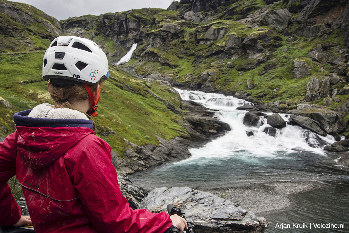 “Bij Myrdalsberget, vlak bij het treinstationnetje van Myrdal, knijpen we in de remmen. Via een hele reeks opeenvolgende haarspeldbochten zien we fietsers afdalen, de diepte in.”