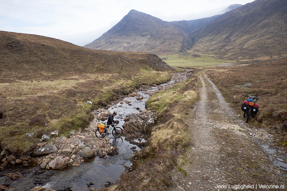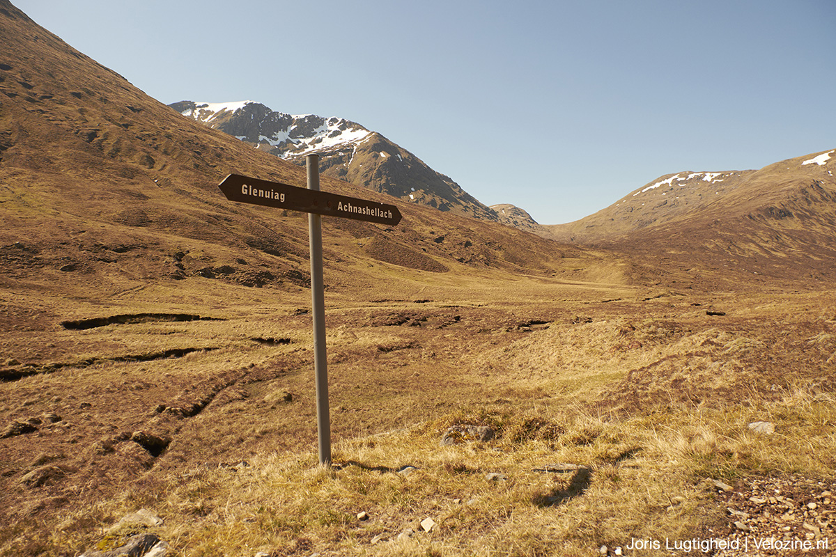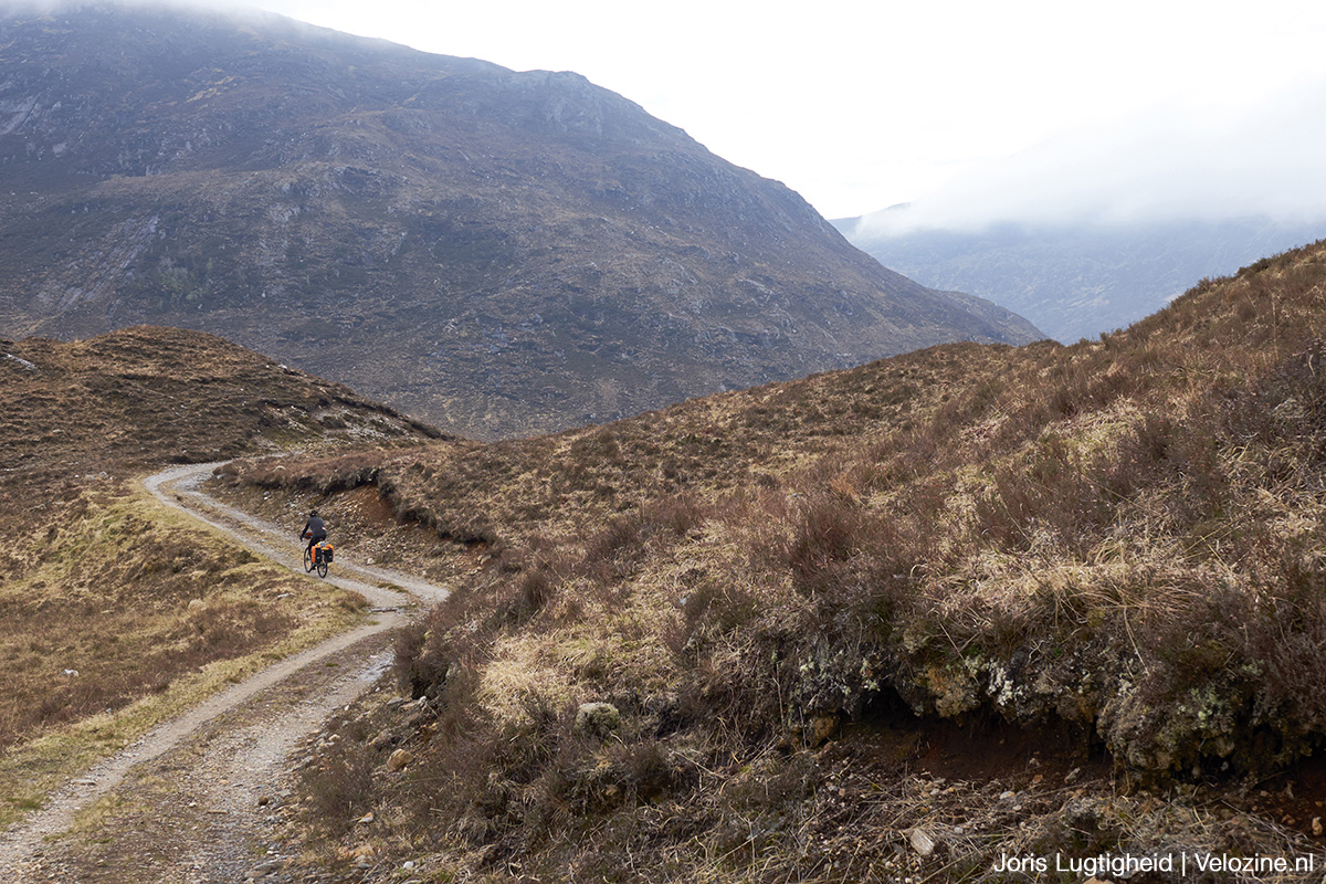 Applecross is niet het enige dat onze Schotlandreis bijzonder maakt. Het wat vlakkere deel bij Inverness waar je tussen de landerijen fiets, is minstens zo fraai. Of de bossen bij Strathconon, slapen óp het strand van Gairloch met uitzicht op The Isle of Skye en de volkomen verlaten bergpassen van de Highlands. Het is eigenlijk allemaal heel speciaal. Maar als ik dan tóch moet kiezen als mooiste en meest bijzonder, dan is het onze overnachting in Glenuaig. Deze bergpas is de kortste weg richting Applecross en volgens de kaart fietsbaar, want er staat tenslotte een stippellijntje. De praktijk is echter iets weerbarstiger.