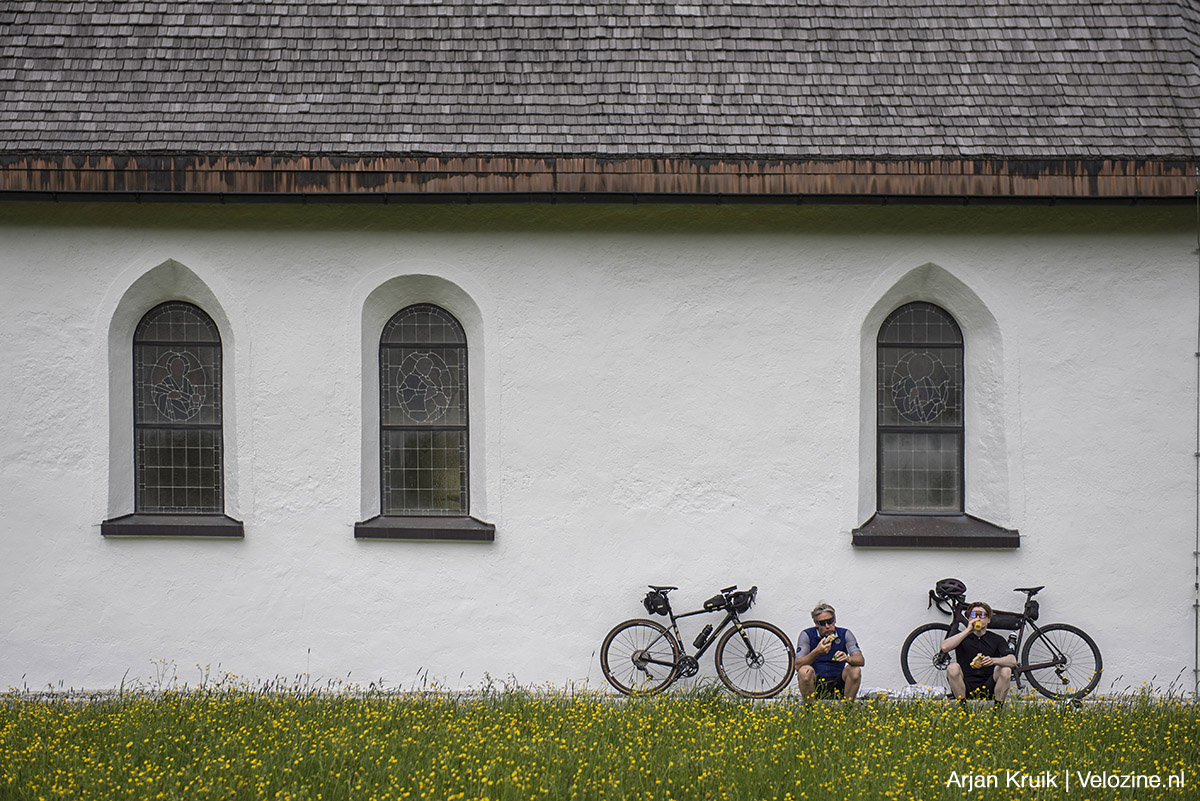 Aan het eind van het Vilstal, we zijn de grens dan alweer over, klimmen we via een kleine pas het Tannheimer Tal weer in en rollen we over de vlakke dalbodem weer naar Tannheim. Omdat we nog niet gegeten hebben, scoren we bij de plaatselijke supermarkt wat vers belegde broodjes, die we aan de achterkant van de Mariakapel lekker opsmikkelen. Mmm!
