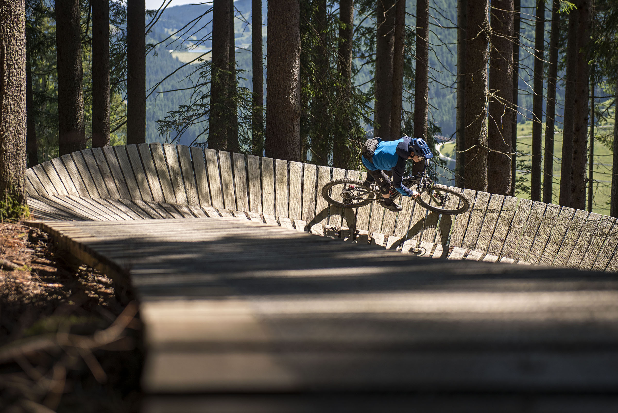 De Isskogel-trails zijn niet nieuw; ze liggen er inmiddels een kleine tien jaar. De aanleg werd verzorgd door RideAble, een bedrijf dat gespecialiseerd is in biketrails en funparks. De aanleg was echter allesbehalve eenvoudig, herinnert Alex Ganster van RideAble zich wanneer ik hem om meer details vraag. “De Zillertal Arena legde de lat hoog”, vertelt de Oostenrijks trailbouwer. “We kregen niet alleen de opdracht om vijf trails te bouwen met verschillende moeilijkheidsgraad en elk bovendien met een eigen karakter, maar die trails moesten ook nog zo natuurlijk mogelijk in het landschap geïntegreerd worden, met minimale impact op de omgeving. Een enorme klus, waarmee we tweede seizoenen zijn bezig geweest. Nou ja, “we”… De lokale gemeenschap heeft flink bijgedragen. Zo hebben timmerlieden uit Gerlos de honderden meters aan plankieren in elkaar gespijkerd waarmee we de natte delen hebben moeten overbruggen”, aldus de Oostenrijkse trailspecialist.