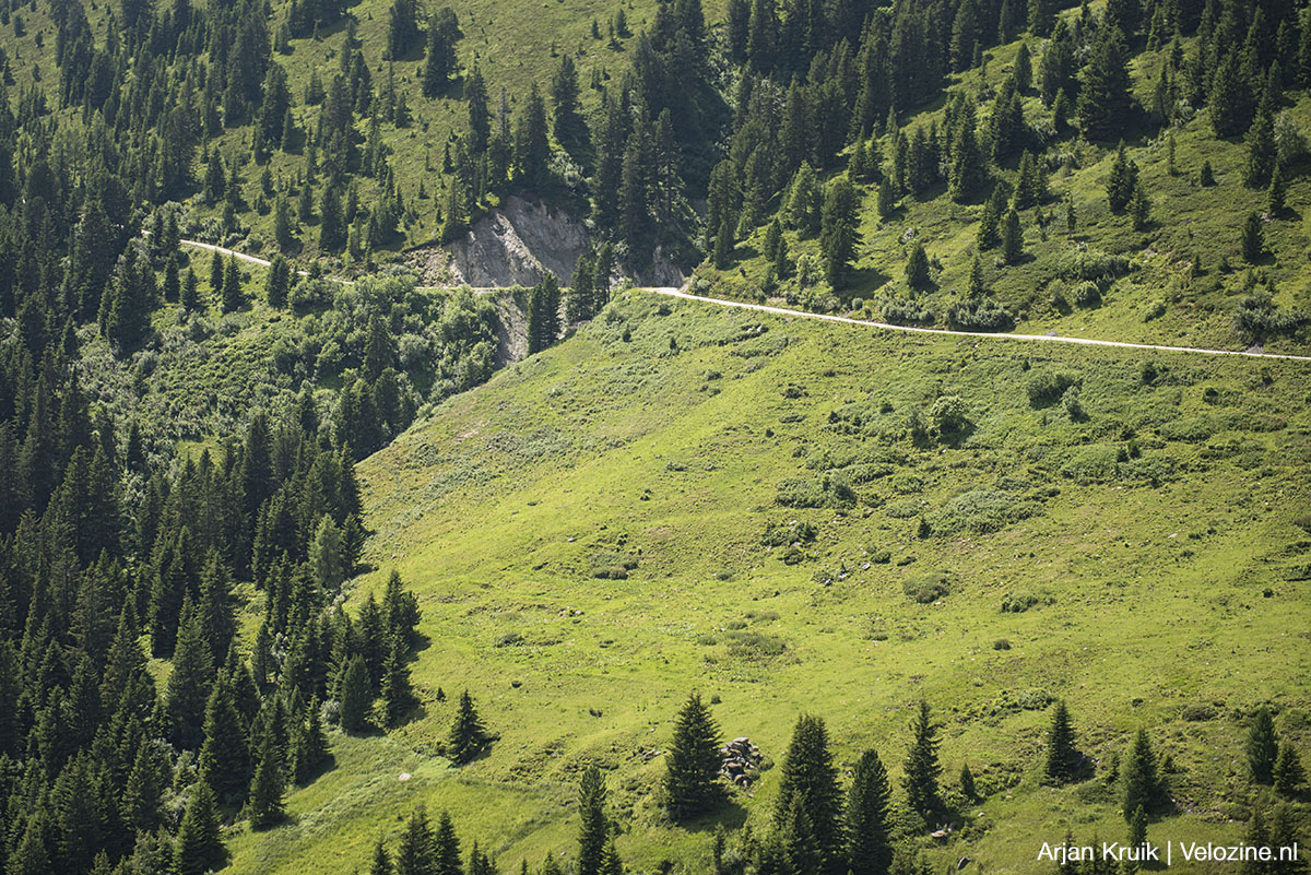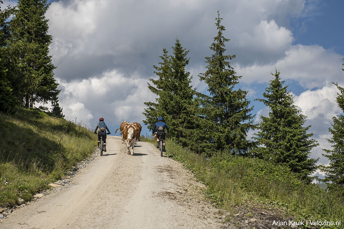 Klinkt goed en ís ook goed, zo blijkt. Want de Panoramaweg is werkelijk prachtig. Deze gravelweg glooit en plooit zich zonder al te extreme hoogteverschillen door het landschap. En omdat we ons min of meer op de boomgrens bevinden, is er vrijwel steeds vrij zicht op de bergen rondom. Prachtig! Maar het plan om helemaal naar de aansluiting met de Wiesenalm-trail te rijden blijkt toch wat te ambitieus. We stranden uiteindelijk bij de Kreuzwiesenalm, een gezellige hut aan de zuidkant van de Karspitze. En daar maken we rechtsomkeer, terug naar Gerlos. Jammer, volgende keer iets beter plannen. En geen foto’s maken, dat helpt ook.