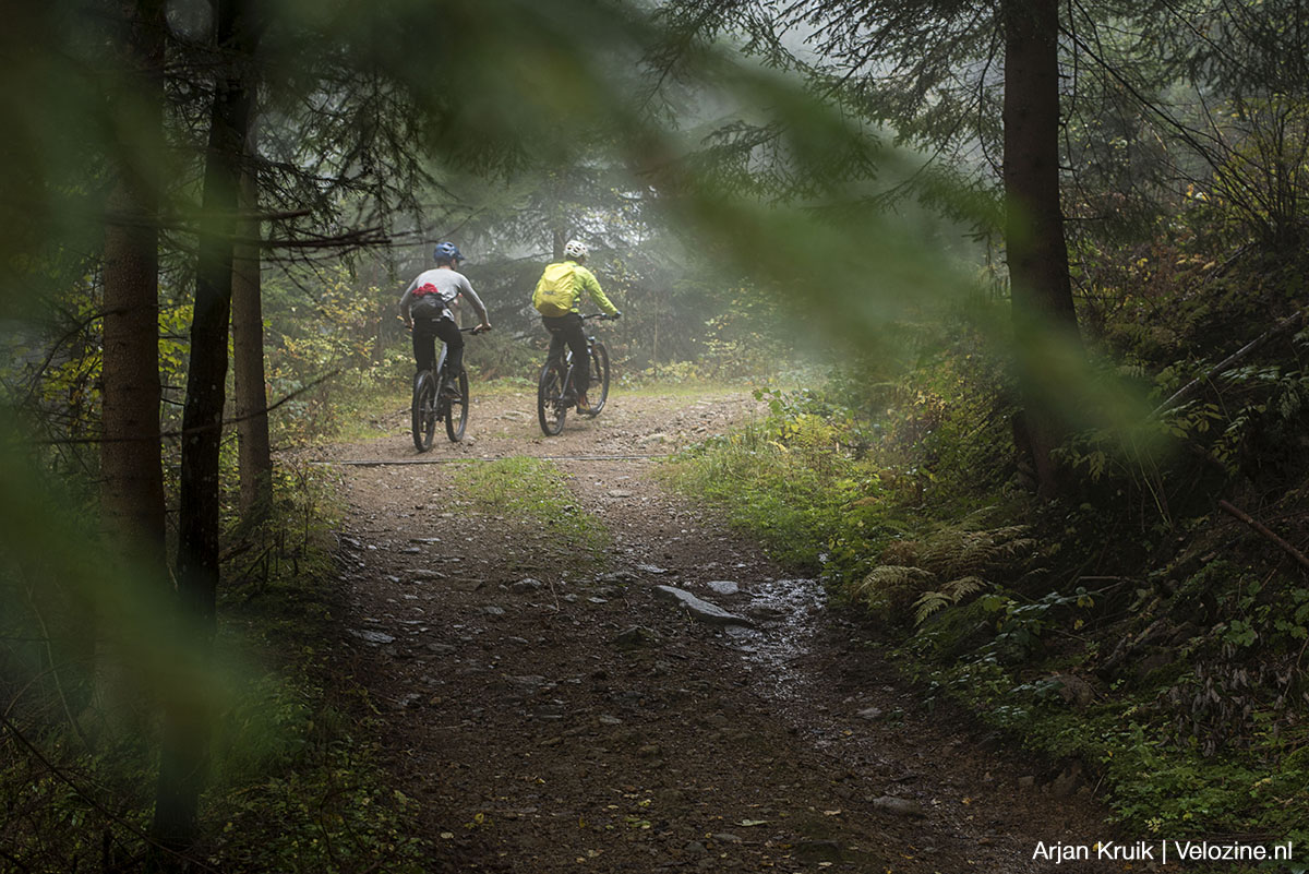 Het heeft de hele nacht geplenst en dat is te zien ook. Alles is kletsnat en het dal hangt nog vol hangt met wolken. Dat ziet er niet uit als mountainbikeweer. Maar Patrick denkt daar anders over. “Jullie zijn toch niet van suiker?” Hij heeft gelijk. Bovendien gaat het volgens de weer-apps pas rond een uur of twee weer echt plenzen. Als we voor die tijd weer binnen zijn, is er dus niks aan de hand. Kortom: snel hullen we ons in Gore-tex en slaan onze benen over het zadel.