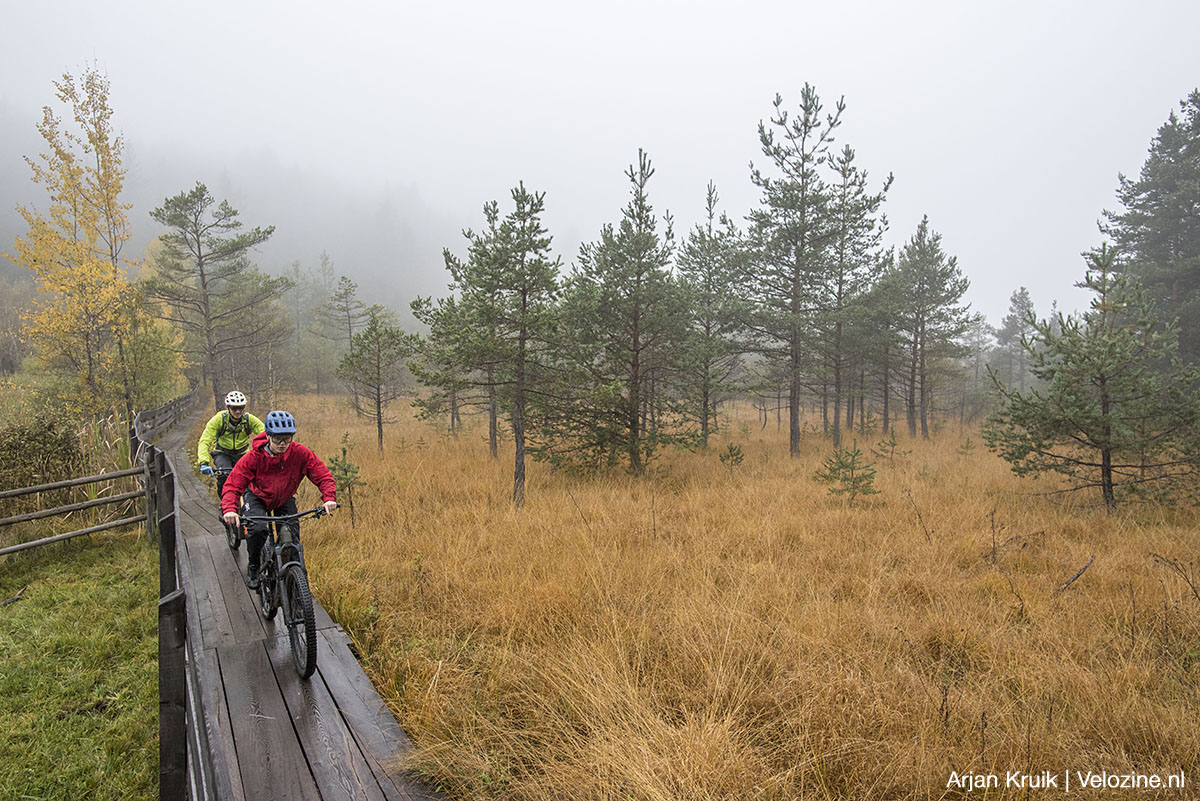Wel ben ik al snel m’n oriëntatie volledig kwijt. Of we zitten tussen de bomen óf we kunnen vanwege de laaghangende bewolking niet verder kijken dan een paar honderd meter. Maakt niet uit, we blijven gewoon lekker in Patricks wiel hangen. Woeha!