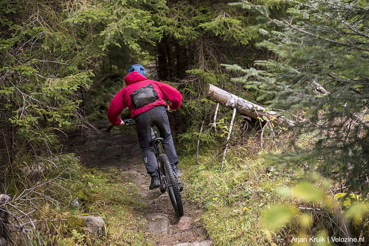 Het is lastig de afdaling die na de Rosengarten volgt te beschrijven. Sebastiaan en Patrick hebben namelijk stilzwijgend besloten alle registers open te trekken. Volle bak rollen ze naar beneden. Het enige dat ik kan doen, is proberen te volgen. Wat natuurlijk een kansloze exercitie is, want van de bikebeheersing en de fitheid van deze twee jonge gasten kan ik alleen maar dromen. Daar komt bij, dat veel secties vanwege de regen van vannacht nog behoorlijk nat zijn en dat maakt het er niet makkelijker op. Gelukkig staat Patrick op cruciale knoopunten te wachten. Het is hier namelijk een wirwar van wegen en paden. Natuurlijk, je kant altijd blind een pad induiken. Maar ik vind het wel prettig om iemand als Patrick bij de hand te hebben. Als hij zegt dat het kan is, dan kan het.