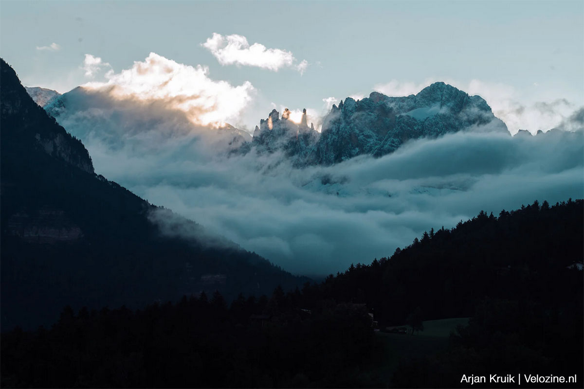 Deze keer strijken Sebastiaan en ik neer in het dorpje Steinegg in het Eggental/Val d’Ega, zo’n vijftien kilometer ten oosten van de stad Bozen/Bolzano. We zijn al een kleine week voor Velozine in Italië onderweg en het Eggental is onze laatste stop. De reden dat we dit dal aandoen: de fameuze Dolomieten-massieven Latemar en Rosengarten. Die laatste, de Rosengarten, zou vanaf ons hotel zichtbaar moeten zijn, maar dat is helaas niet het geval. Het is al op de autostrada begonnen met regenen en hier in de bergen is dat zeker niet minder geworden. Het zicht rondom is ongeveer nul.