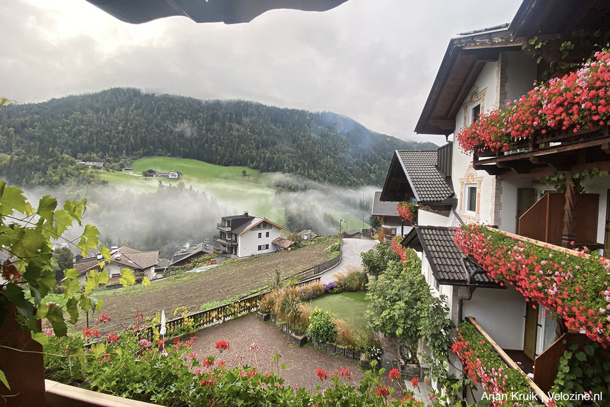 Deze keer strijken Sebastiaan en ik neer in het dorpje Steinegg in het Eggental/Val d’Ega, zo’n vijftien kilometer ten oosten van de stad Bozen/Bolzano. We zijn al een kleine week voor Velozine in Italië onderweg en het Eggental is onze laatste stop. De reden dat we dit dal aandoen: de fameuze Dolomieten-massieven Latemar en Rosengarten. Die laatste, de Rosengarten, zou vanaf ons hotel zichtbaar moeten zijn, maar dat is helaas niet het geval. Het is al op de autostrada begonnen met regenen en hier in de bergen is dat zeker niet minder geworden. Het zicht rondom is ongeveer nul.