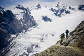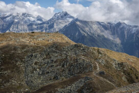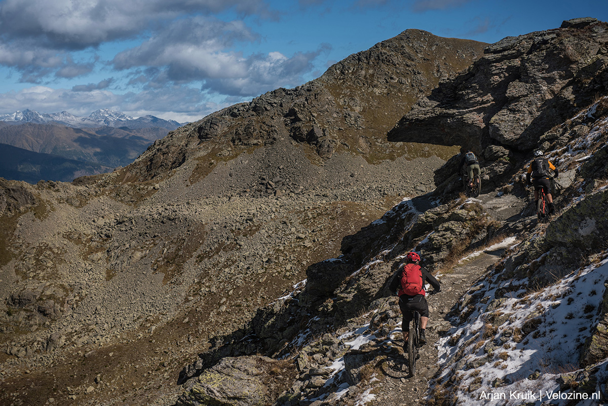Klim je normaal gesproken omhoog om daarna te kunnen afdalen over toffe trails – dat is in ieder geval meestal mijn insteek – bij de Demut-ronde ligt dat toch iets genuanceerder. De klim en de daarop volgende spectaculaire kam-trail staan centraal en de afdaling hangt er eigenlijk maar een beetje bij. Wat ik bedoeld is dat je tijdens de terugkeer naar het startpunt een groot aantal hoogtemeters ‘verspilt’ met afdalen over brede grindpaden. Tja, dan is nou eenmaal de aard van deze verder fenomenale hooggebergtetocht. Maar gids Arno is natuurlijk niet van gisteren en hij bespeurt de teleurstelling bij Henk en vooral Frank. Die had zich erop ingesteld om tot in het dal trails te rijden…