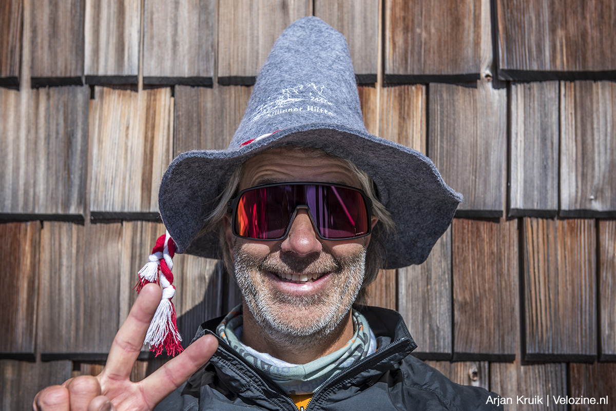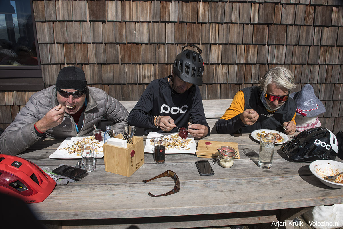 Even slikken dus en vooral niét naar beneden lijken, maar ver voor je uit. En rustig doortrappen. M’n hartslag schiet desondanks de hoogte in. En dat ligt dit keer niet aan de dunnere lucht of het stijgingspercentage… Gelukkig gaat alles goed, op het laatste deel na. Daarvoor zijn mijn rijtechniek en vooral kracht op dit moment ontoereikend. Natuurlijk rijdt Arno er gewoon omhoog, ik verwacht inmiddels niet anders. Maar fietsmaatje Frank laat zich deze keer niet kennen en blijft de gehele Demut-passage in het zadel. Forza Frank, forza!