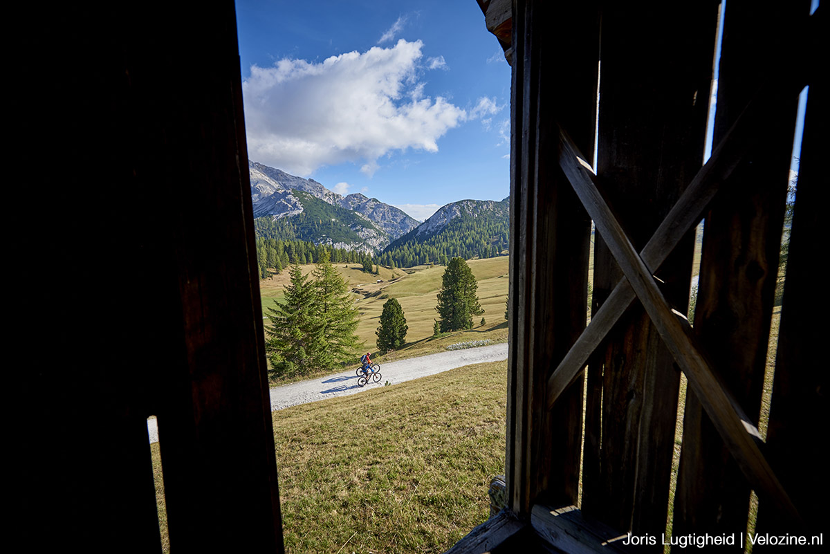 We starten de Plätzwiese-ronde in het plaatsje Toblach. Lukas is er niet bij, maar gelukkig neem z’n sympathieke collega Michael de honneurs waar. Relaxed rollen we over een gravelweg door het Höhlensteintal – een zijdal van het Pustertal – in de richting van Cortina d’Ampezzo. Even voorbij Toblach rijden we langs het gelijknamige meer. Het heldere water ziet er verleidelijk uit, maar een zwembeurt slaan we toch over. We zijn immers nog maar net gestart en hebben er nog geen behoefte aan om af te koelen. En omdat we maar zeer geleidelijk klimmen en de ondergrond van fijne gravel makkelijk rolt, blijft dat tot de Passo di Cimabanche ook zo. Op de hellingen en rotsen links en rechts van de weg treffen we in de vorm van fortificaties en mitrailleursnesten stille getuigen aan van de Grande Guerra, de Grote Oorlog, zoals de wereldoorlog van 1914-1918 hier genoemd wordt.