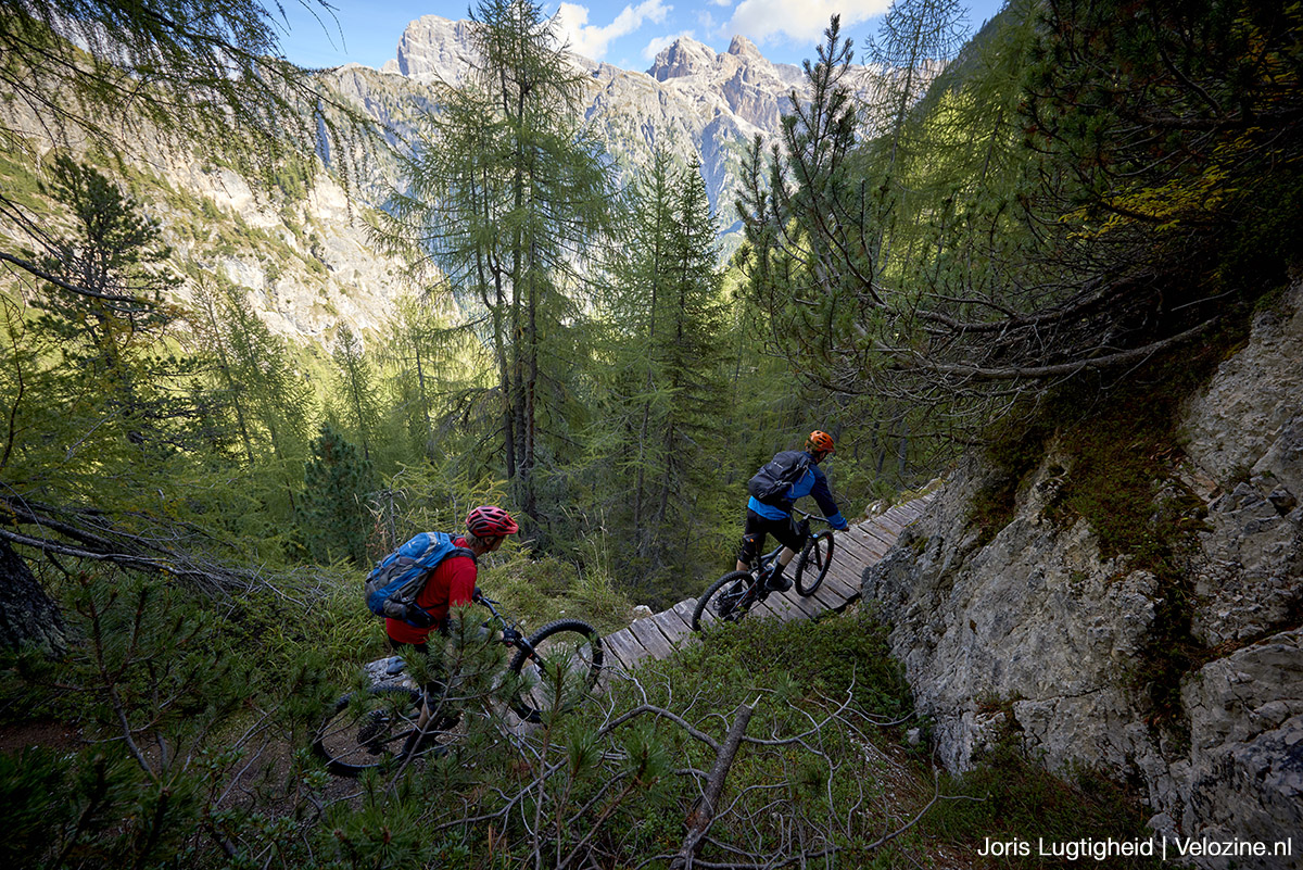 Als je de Dürrensteinhütte bereikt hebt, kun je vanaf daar naar beneden om het rondje af te maken. “Dat kan op twee manieren”, vertelt Michael een beetje geheimzinnig. Hij laat het zien op de kaart: “We kunnen de officiële route volgen. Die loopt in het verlengde van schotterstraße waarover we omhoog gekomen zijn naar het noorden toe, met als je wilt zo nu en dan een stukje singletrack. Maar er is ook een veel uitdagender variant, een oude militärsteig die via de oostelijke flank van de Dürenstein door het Helltal naar het Höhlensteintal loopt. Supermooi, maar ook nogal uitdagend. Laat ik het zo zeggen: je moet geen hoogtevrees hebben…”