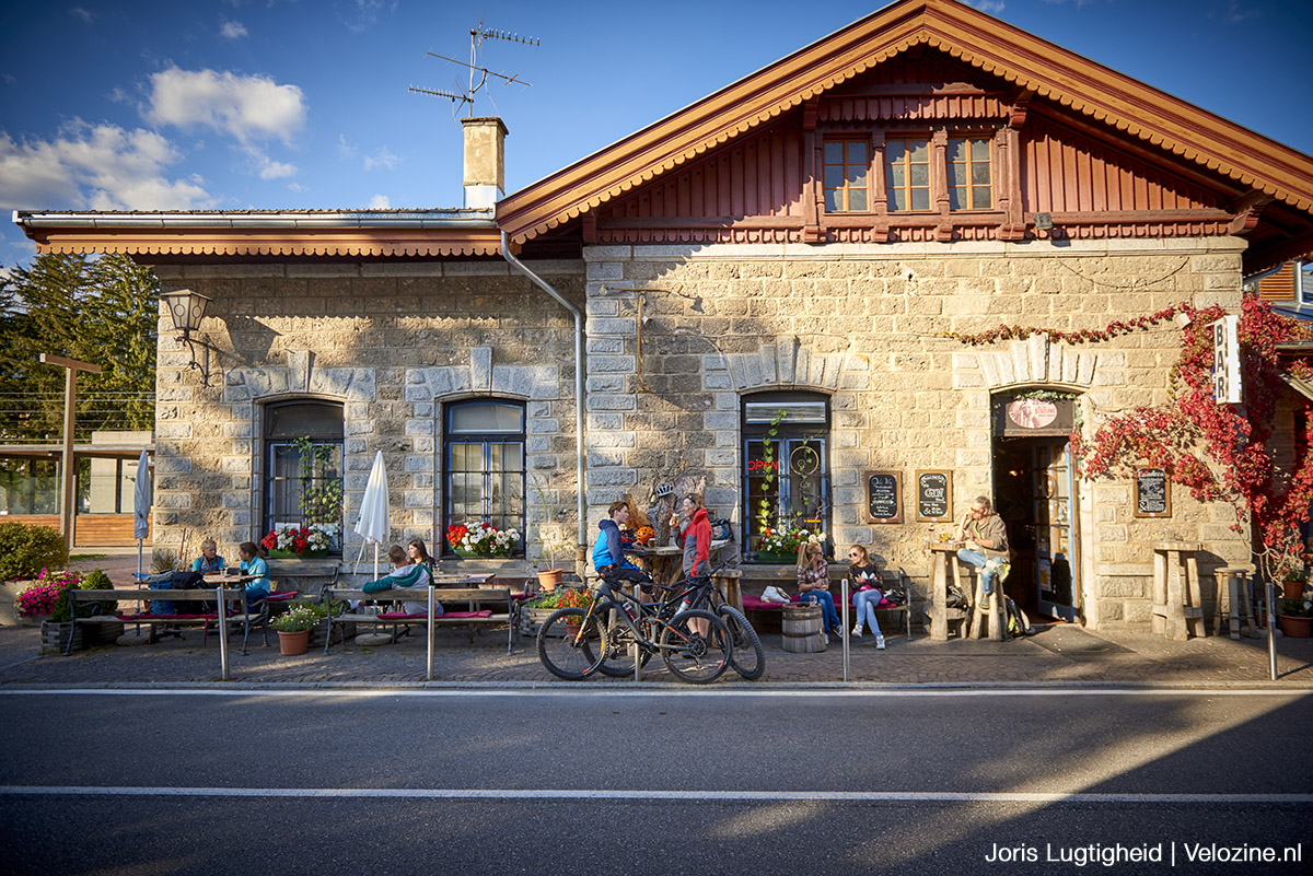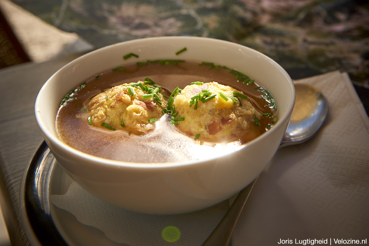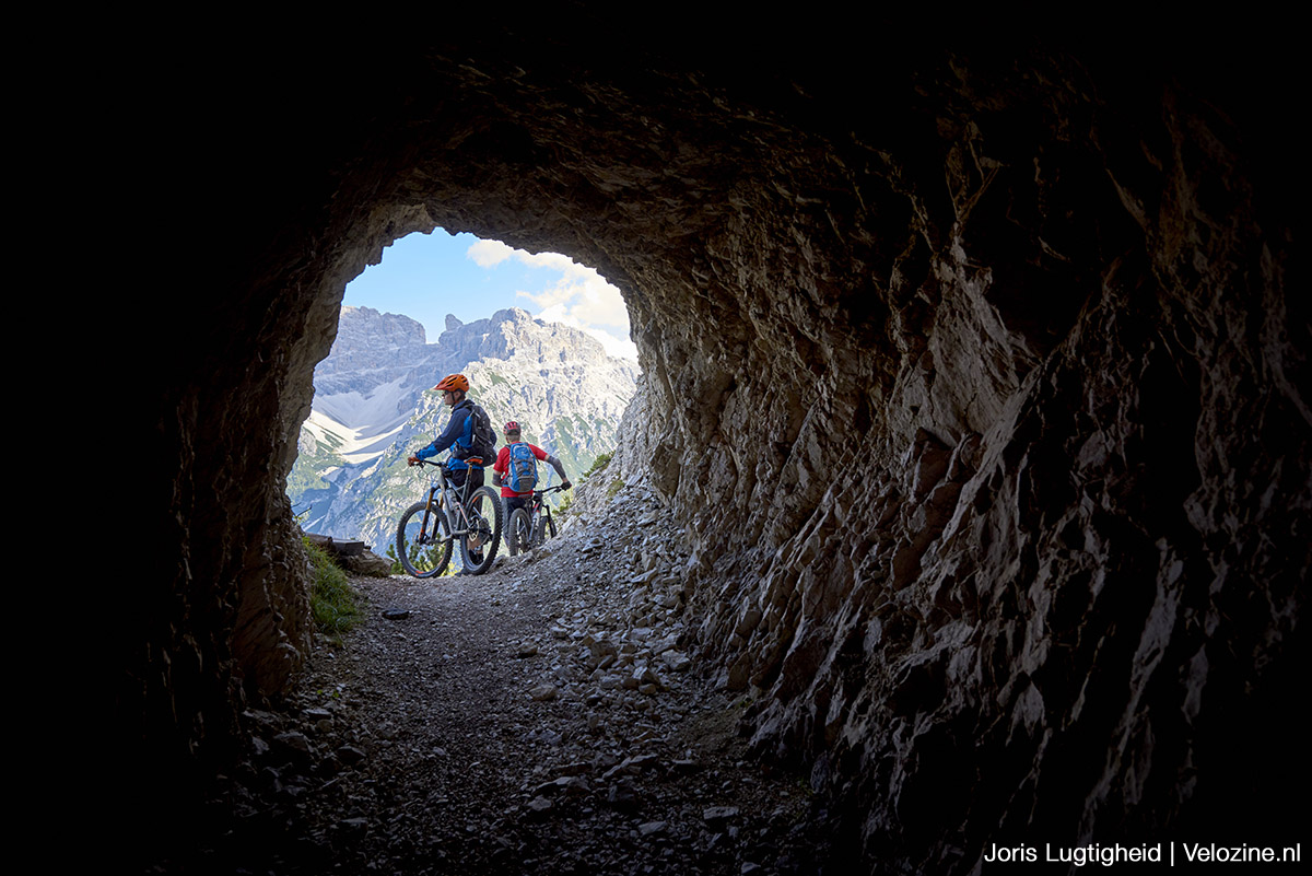 Overigens moet ik niet veel later toch nog stoppen, want Sebastiaan heeft een paar stellingen uit de Eerste Wereldoorlog gespot die ik zeker even wil bekijken. Vanaf daar is het trouwens nog maar een klein stukje dalen, want niet veel later rollen we het Höhlensteintal in. Bij een restaurant met de naam Drei Zinnen schuiven we aan voor een bord soep met brood en een groot glas holunder en bespreken we de route. Onze conclusie: een tocht om nooit te vergeten, maar qua afdalen wel aan de pittige kant. Habanero-pittig zelfs. De officiële afdaling aan de westkant is dus een veiliger en verstandiger keuze.