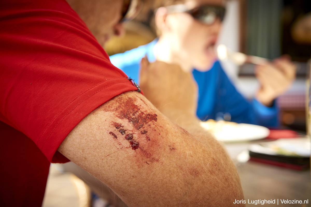 Via tunnels, houten plankieren en trappen verliezen we steeds meer hoogte, tot we de puinwaaier aan de voet van de rotswand bereiken. Hier is er weer ruimte en is het pad weer fietsbaar. Nee, nog steeds niet met twee vingers in m’n neus, maar wel goed te doen. Alhoewel, als ik in m’n enthousiasme de remmen iets te lang loslaat, verslik ik me in een serie nét iets te steile treden, wat resulteert in een klassieke over-de-kop-actie. Gelukkig loopt het, op een schaafwond, wat blauwe plekken en een gebutst ego na, allemaal goed af. En weer dóór, want dat is mijn tactiek bij een val: gelijk weer opstappen. Anders gaat het maar in je hoofd zitten en dat is niet handig als je nog verder moet afdalen.