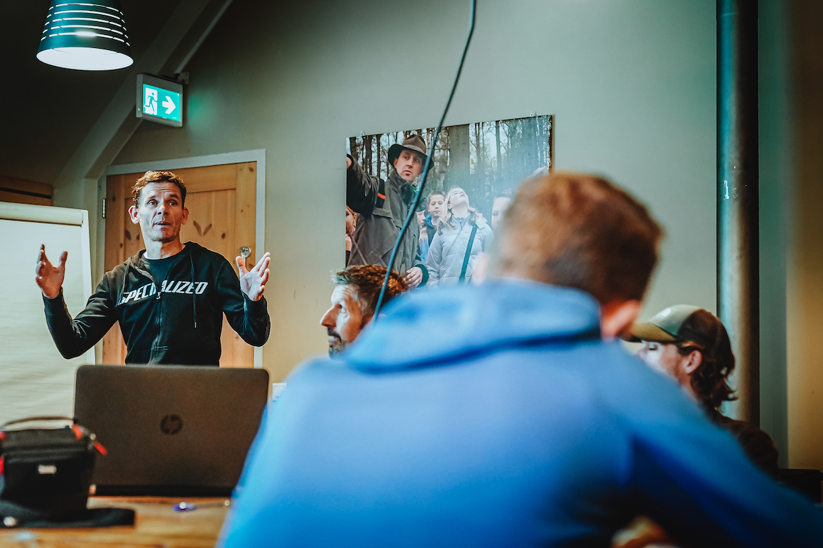 Tijdens een informatiebijeenkomst, onlangs georganiseerd door Specialized en Staatsbosbeheer, vertelt boswachter én fanatiek mountainbiker Rein Zwaan over hoe de nieuwe mountainbikeroute tot stand is gekomen, hoe die beheerd wordt, en welk ander belangrijk werk Staatsbosbeheer verricht