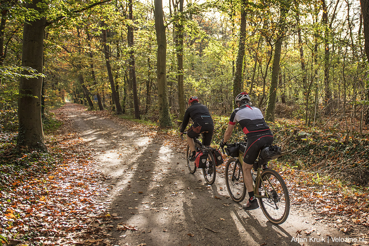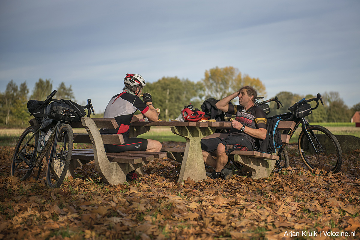 Waarvan acte, want reisgenoot Bas hebben we al heel lang niet gezien en we hebben dus heel veel bij te praten. Zo vliegen de 86 kilometers die we de tweede fietsdag moeten afleggen onder onze wielen door. Over asfalt, klinkers, gravel en zand, maar ook over betonplaten en houten planken en zo nu en dan door dikke pakketten afgevallen bladeren. Wat dat betreft is de naam ‘gravelbike’ nogal eendimensionaal. Ze zouden beter de in onbruik geraakte afkorting ‘ATB’ kunnen afstoffen en hergebruiken. De term all-terrain-bike doet namelijk veel meer recht aan de veelzijdigheid van onze noppenbandenfiets-met-racebocht…