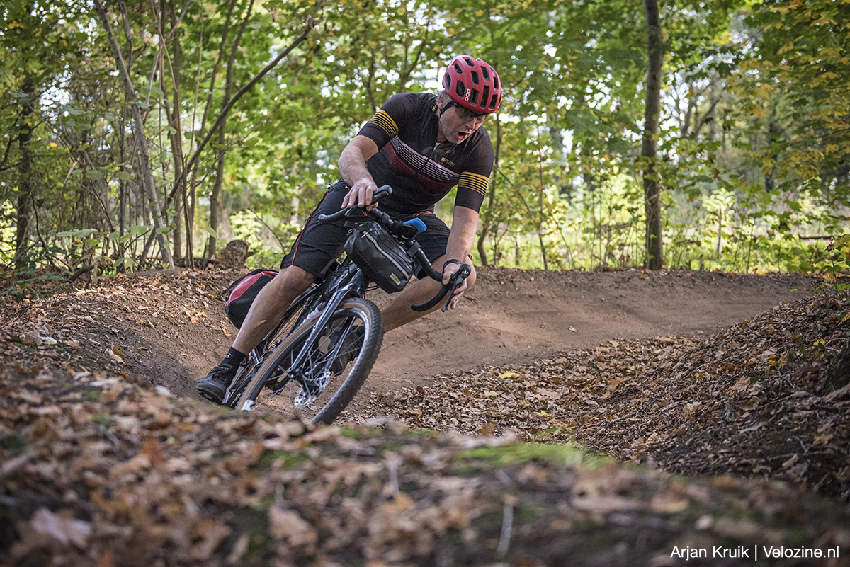 Ook het gebogen stuur is prettig. Sowieso vanwege de geringe breedte, die op lange rechte stukken een meer ontspannen houding oplevert dan een breed mountainbikestuur. Daarnaast is het fijn om bij lange rechte stukken en de wind op kop onderin de beugel te kunnen hangen. Maar het klimt wel minder goed, zo blijkt als we de tweede dag, direct na het ontbijt, de Lochemse Kale Berg moeten beklimmen. Zeker als je staand gaat klimmen lukt dat met een breed mountainbikestuur gewoon beter. En afdalen doe ik met m’n mountainbike ook soepeler. Ach ja, horses for courses.