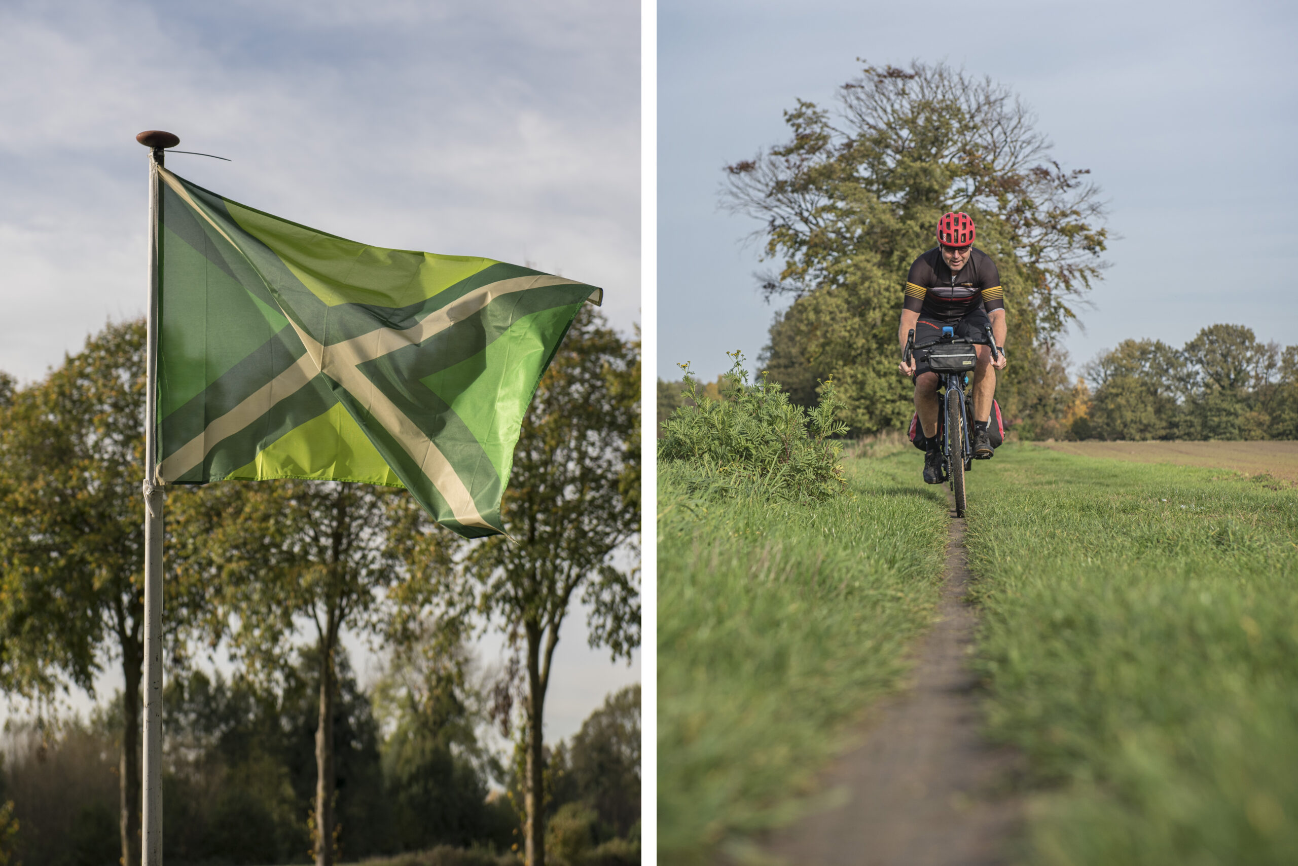 Als we het terrein van van Camping Vreehorst verlaten voor het rijden van de derde en laatste etappe, trekken de laatste regenwolken net weg. En na een paar kilometer trappen heeft de zon het weer voor het zeggen. De laatste lus van onze Trans-Achterhoek is korter dan de voorgaande etappes. Waren die eerste twee ruimschoots langer dan 80 km, nu rijden we maar net iets meer dan de helft daarvan. We zouden dat zonder gps kunnen doen, aangezien de route van vandaag is uitgepeild met het bekende mountainbikesymbool. Deels parallel aan ‘onze’ route lopen aan de noordkant van Winterswijk bovendien nog flink wat singletracksecties voor mountainbikers. Als je niet de groene, maar de paarse bordjes volgt kun je die ook op de gravelbike gewoon nemen. Zo pak je niet alleen extra kilometers mee, maar ook nog een extra portie spanning en sensatie!