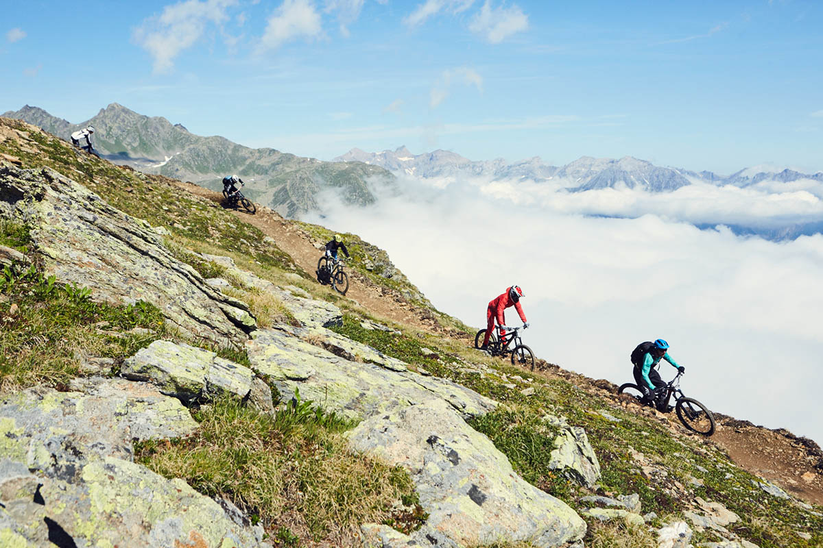 - Frommestrail: Deze heeft het allemaal! Na de lift vanuit Fiss is het nog zo’n 5 minuten klimmen tot je bij het Frommeskruis komt, met uitzicht op de Inn vallei. Eerst duikt het pad draaiend en kerend langs weides en afgronden omlaag, om vervolgens 3 korte gemene klimmetjes voor te schotelen. Daarna krijg je meer ruwe alpine paden, een stuk absurd hard over de piste omlaag en sluit je af met smalle paden over worteltapijten en door rockgardens. Wie doorrijdt is na de hele 8,7 km vermoeid beneden.