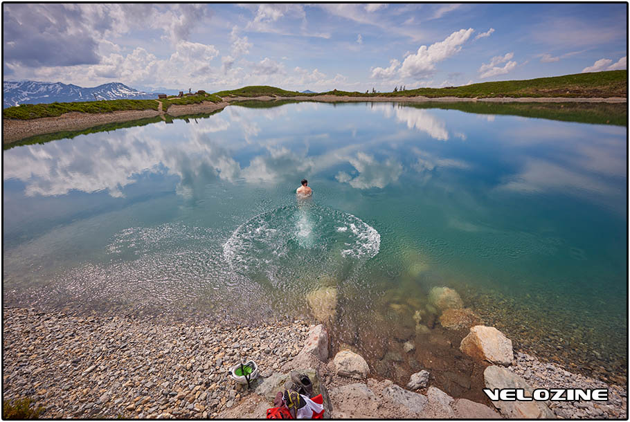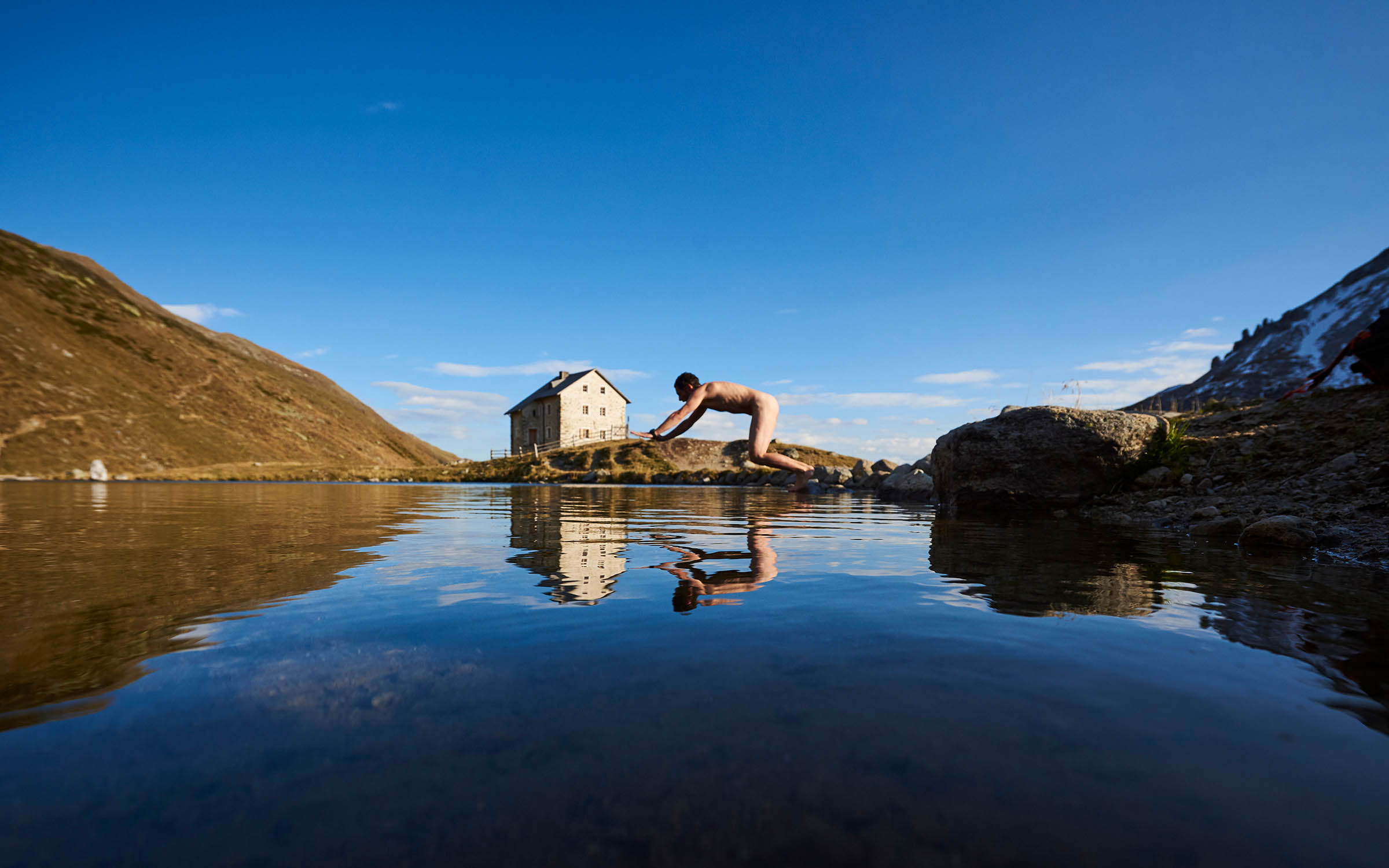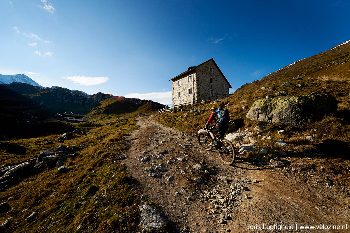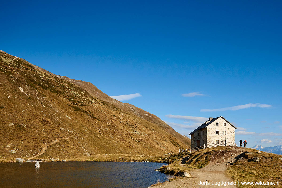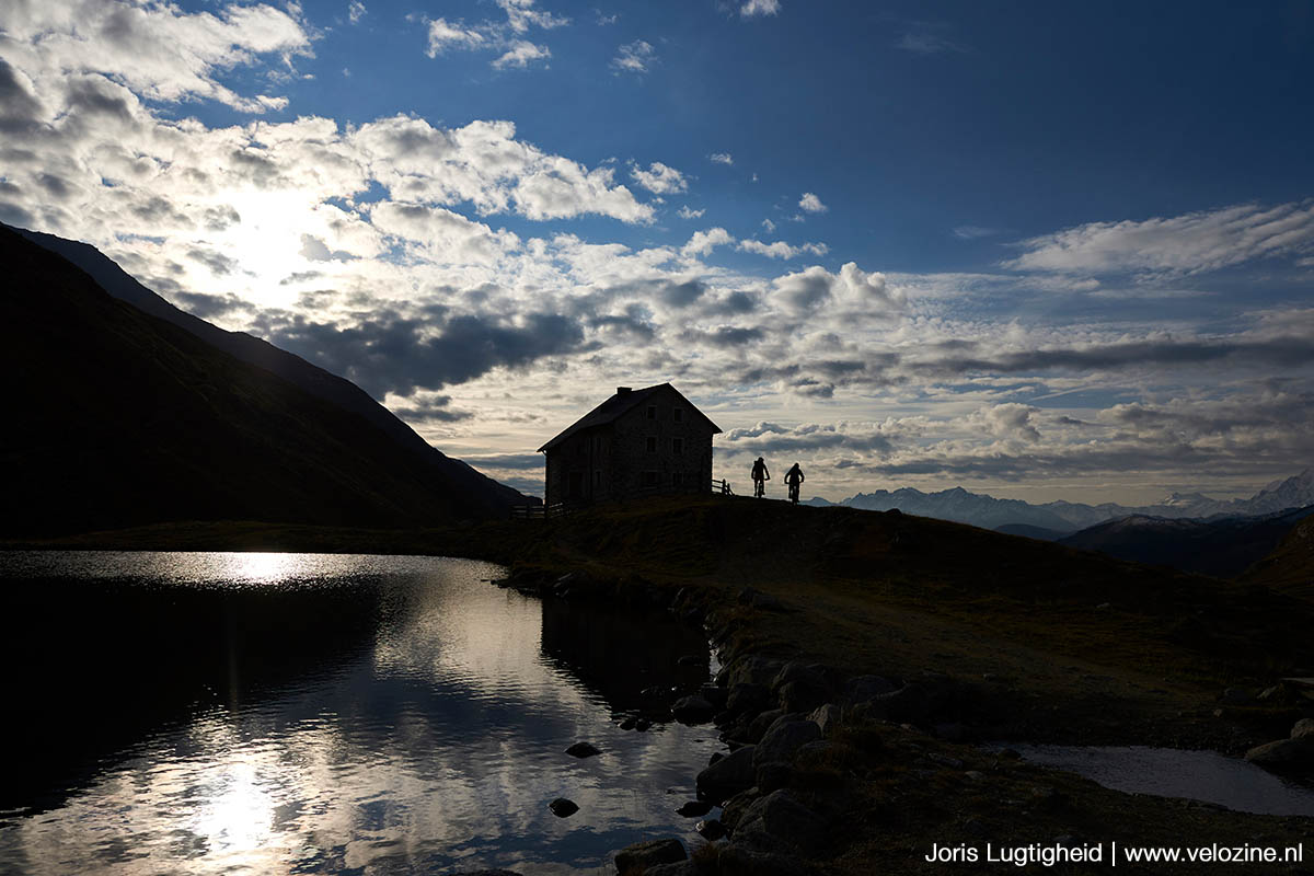 Maar goed, ik doe het dus met de benenwagen en dan kom je ook boven. Overigens, als je na de imposante loodrechte wand op de hoogvlakte belandt bent, zijn de laatste paar honderd meter naar de Sesvennahut prima te fietsen. Fijn voor m’n zelfrespect, lopend aankomen bij een berghut is ook zo sneu. Trouwens, de kleinste van de twee Jorissen in mijn gezelschap moét wel fietsen. Hij is namelijk tot op het bot verkleumd. Dat zit zo: Joris heeft er een gewoonte van gemaakt, om in ieder bergmeer dat hij tijdens zijn mountainbiketochten tegenkomt even een frisse duik te nemen. En fris, dat is in het geval van het meertje vlak voor de Sesvennahut slechts vier graden. Brr!