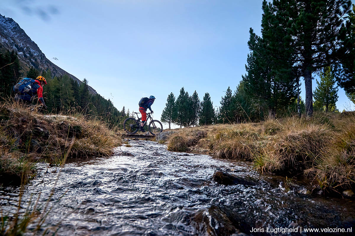Je kunt de Uinakloof op twee manieren aanrijden: vanuit Zwitserland of vanuit Italië. Op advies van Harry Ploner doen we dat laatste. Reden één: de beklimming van de kloof vanuit het Zwitserse Inndal is veel steiler. Reden twee: tussen de kloof en de Sesvennahut ligt een prachtige singletrack waarover het veel leuker dalen is dan klimmen. En tot slot reden drie: als je de Uinakloof vanuit het zuiden aanrijdt, kun je een flinke hoeveelheid hoogtemeters met kabelbanen verschalken. Rond Nauders en de Reschensee stikt het namelijk van de skiliften en ze nemen allemaal bikers mee omhoog. Echt zwaar qua klimmen gaat deze tweedaagse rondtocht dus niet worden. Maar dat is ook niet de bedoeling; het uitgangspunt is dat we zoveel mogelijk trails rijden.