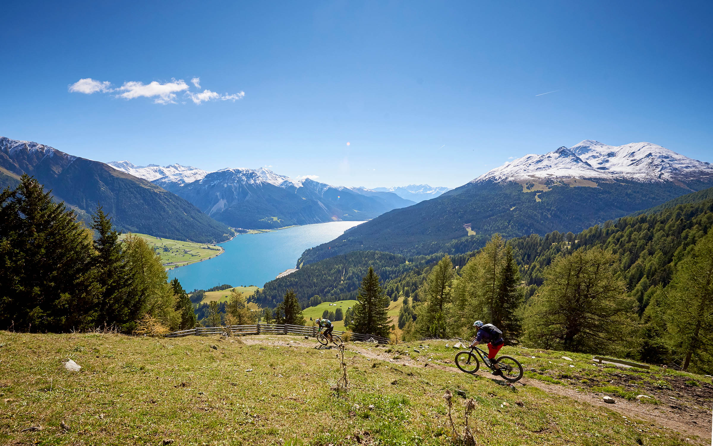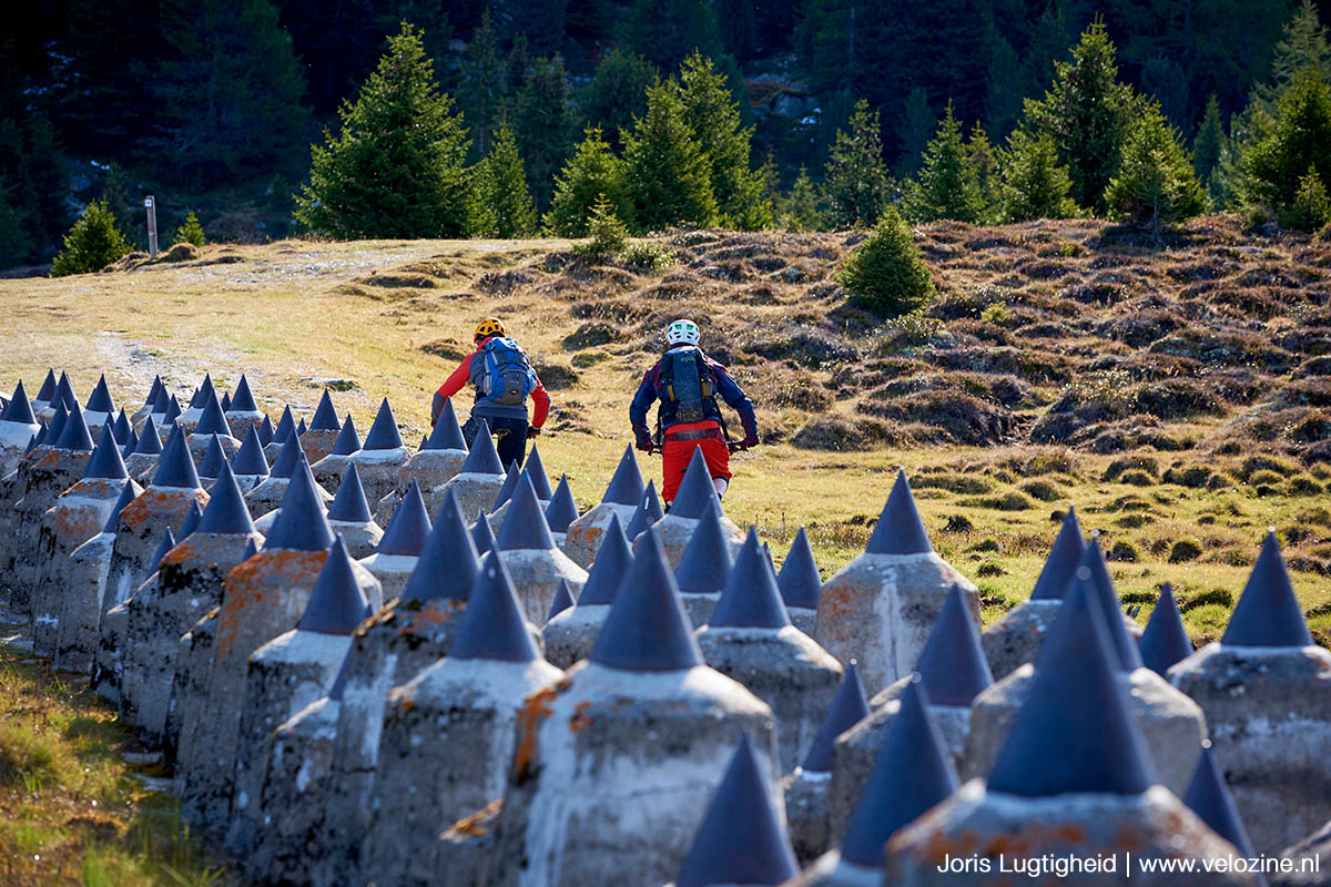 Goed, we rijden dus al vroeg op de Plamort. Voor iedereen die in Nauders komt mountainbiken is dit hoogplateau vaste prik. Vanwege de tankgracht en de bunkers uit de Tweede Wereldoorlog, vanwege het onvoorstelbaar mooie uitzicht over de Reschensee en het achterliggende Ortlermassief en natuurlijk ook vanwege de paden naar beneden. De Bunker Trail bijvoorbeeld. Dit pad ligt zo vol stenen en rotsen dat de vullingen uit je kiezen rammelen. De kaken blijven dus stevig op elkaar, totdat de trail ons een dikke vijfhonderd hoogtemeters lager bij de Reschensee weer uitspuugt. Wat een lekker begin van de dag! Vol adrenaline rollen we langs de oever van het meer naar de gondel van Schöneben, waarmee we weer dik zeshonderd positieve hoogtemeters pakken.