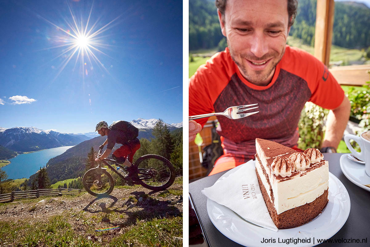 De trails aan de westkant zijn compleet anders dan die op de Plamort. Hier geen rotsen en stenen, maar aarde en wortels. Geen probleem, het pad dat ons naar het zuiden brengt, de Spin Trail, is relaxte flowtrail volgens het boekje. Lekker! Veel te snel naar mijn zin bereiken we het dalstation van de Haideralmbahn aan de zuidkant van de Reschensee. Hup, een gondel in en weer pakken we ruimschoots zeshonderd hoogtemeters. Gingen we na de vorige twee liften nogal slordig met die hoogtemeters om, vanaf nu is het zaak om hoog te blijven. Met behulp van de route-instructies die Harry gisteren in Joris’ gps heeft geladen, lukt dat heel aardig. Geleidelijk dalend en soms een stukje klimmend volgen we een serie paden – met name de laatste, na Prämajur, is echt schandálig lekker! – die ons uiteindelijk naar het bergdorpje Schlinig brengt, middenin het gelijknamige dal. Daar, op iets meer dan zeventienhonderd meter, is het tijd voor het bekende bakkie. Met, omdat we straks toch echt nog zelf een stukje omhoog moeten trappen, een lekker stuk taart erbij. Tussen het café waar we zitten en de Sesvennahut liggen namelijk nog een ruime vijfhonderd hoogtemeters.