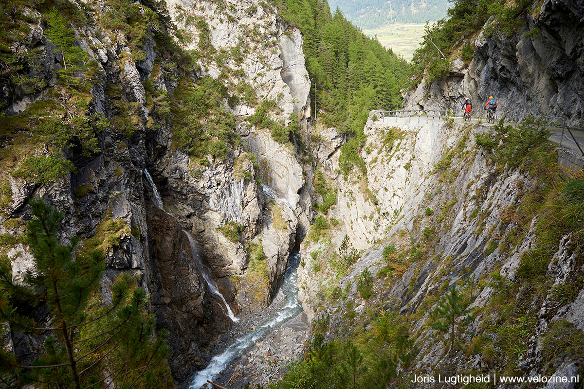 Indrukwekkend hoor, al die beesten. Maar vergeet de trail over de Schlinigpas niet. Ook die is niet te versmaden. Bochten naar links, bochten naar rechts, omhoog, omlaag; het is één grote achtbaan. Zolang het duurt dan, want even na de Italiaans-Zwitserse grenspaal begint de trail stevig te dalen en plotseling rollen we tussen immense grijze rotspartijen door. Je voelt het aan alles, hier gaat het gebeuren; de Uinakloof. En ja, het is net zo spectaculair als gezegd wordt dat het is. Of beter: nóg spectaculairder! Het pad is letterlijk uit een loodrechte wand gehakt. Met aan de bergkant een staalkabel en aan de kant van de kloof een hekje. Soms. Maar niet overal. Met één hand aan de staalkabel en de andere op onze bike klauteren we bedeesd naar beneden. Indrukwekkend.
