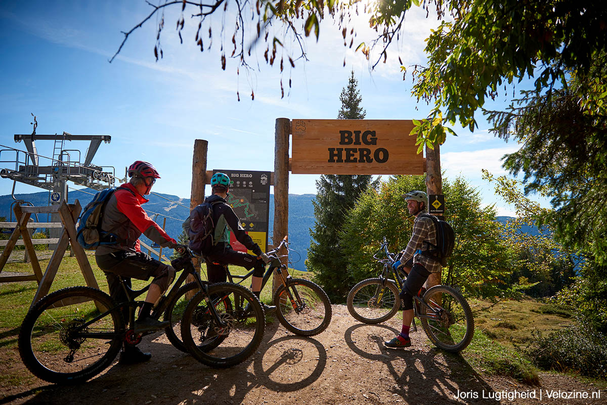 Ook het liftpersoneel is schijnbaar blij dat we er zijn. Uiterst vriendelijk worden we geholpen bij het in- en uitstappen en – bij de stoeltjeslift een verdieping hoger – bij het ophangen van de bike aan de speciale haak aan de zijkant van de stoeltjes. Dat heb ik wel eens anders meegemaakt. En ook als het gaat om de routeinformatie is het hier tiptop geregeld. Bij de ingang van de Big Hero-trail staat een groot bord met detail- en overzichtskaarten waarop te zien is waar je bent en waar je naartoe kunt. Op een apart bord daarnaast is niet alleen door middel van kleurcodes (van groen tot zwart) aangegeven wat het niveau van de verschillende trails en routes is, maar wordt ook het aantal te dalen en te klimmen hoogtemeters vermeldt. Zo kom je onderweg nooit voor onaangename verrassingen te staan.
