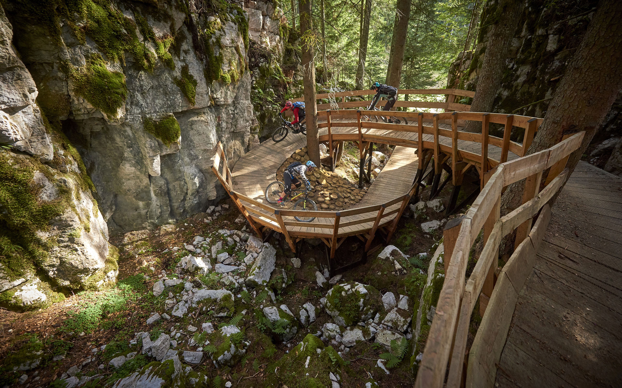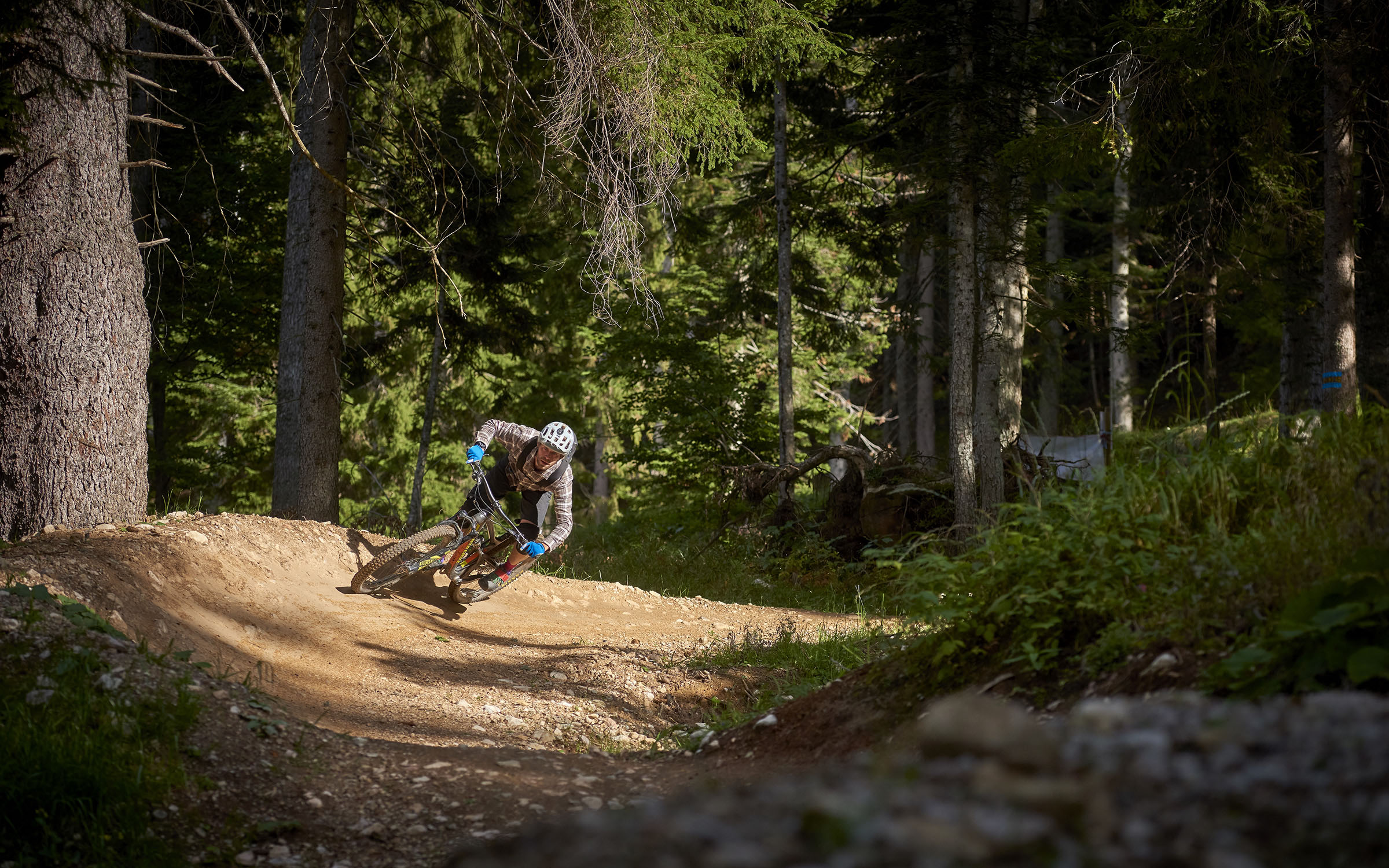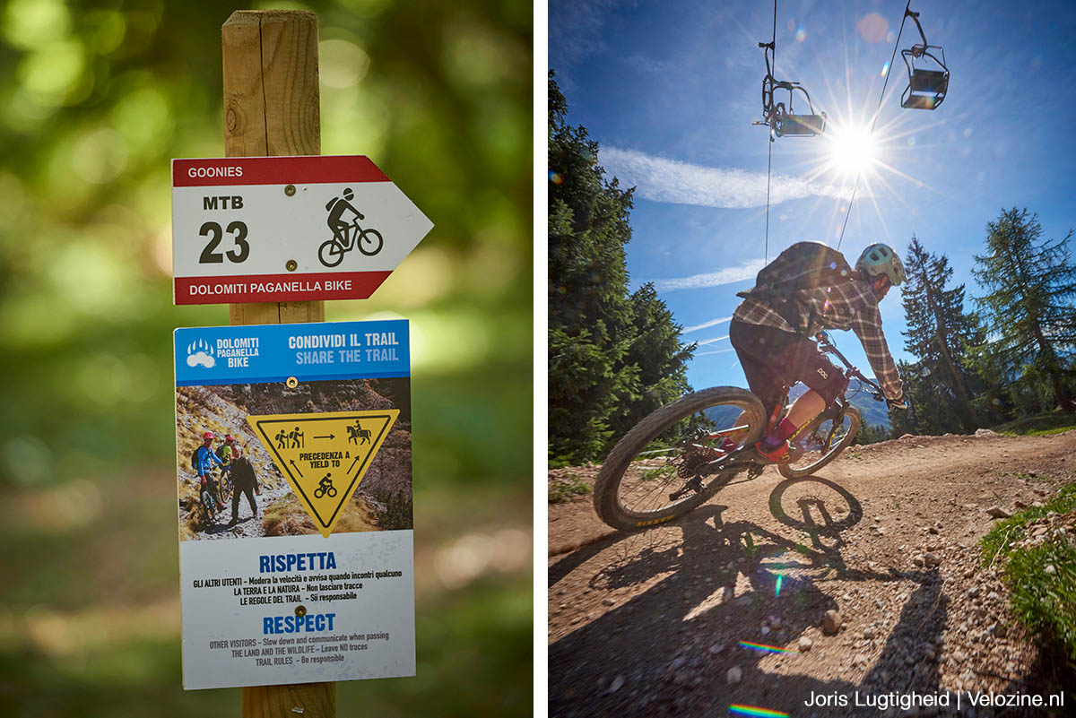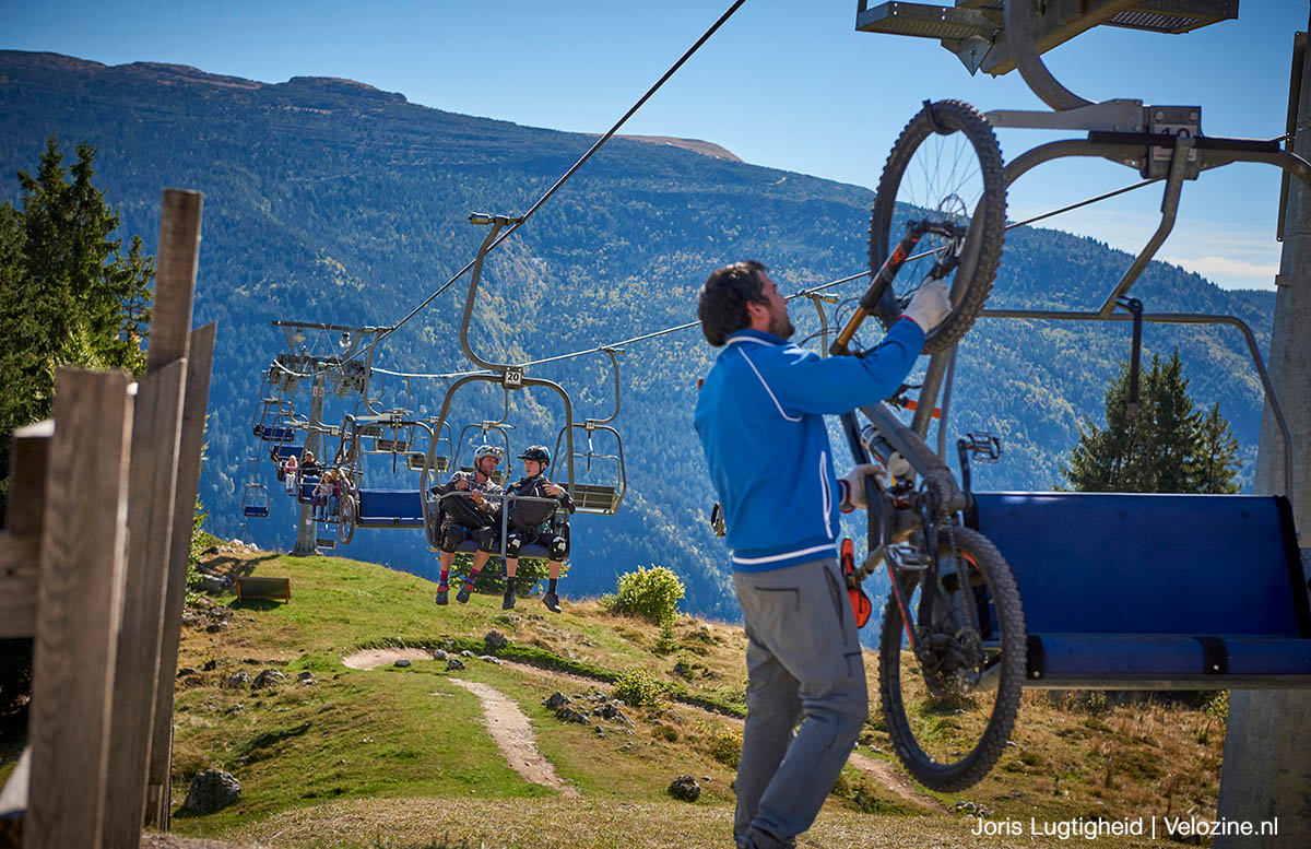 Bij het onderste station van de stoeltjeslift gaat de route over in de Blade Runner en de Goonies. Beide zijn blauw gemarkeerde, toegankelijke routes, waarbij de laatste deels over een bestaand wandelpad voert. “Dat is bewust”, vertelt Davide als we het laatste stukje over de weg afdalen naar de gondel. “We willen een mix bieden van speciaal aangelegde biketrails en bestaande paden, zodat de routes afwisselend blijven. Bovendien is het, om wederzijds respect te creëren, goed dat wandelaars en bikers elkaar op de berg tegen blijven komen. Daarom mag je hier ook niet met een fullface-helm en een skibril op rijden; dat schrikt wandelaars enorm af. ” Goed punt.