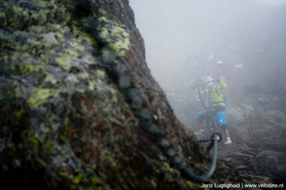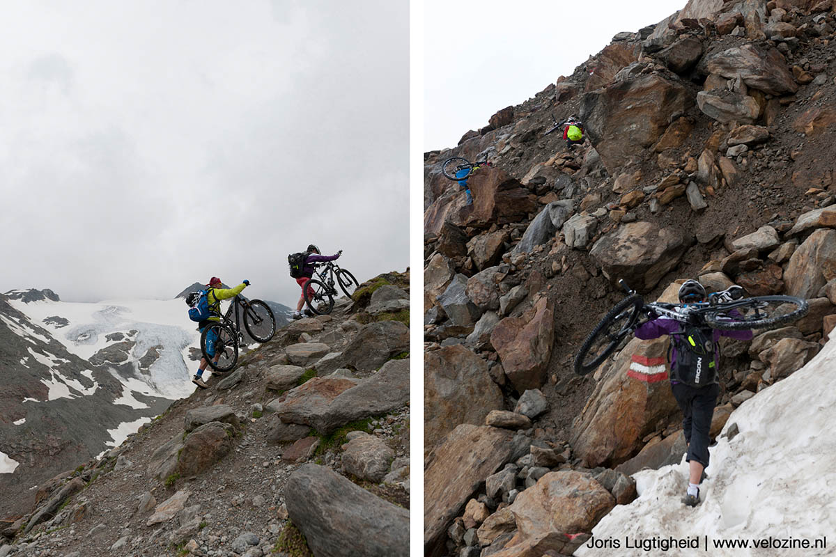 “Maar goed, teruggaan is geen optie. En dus ploeteren we door, over sneeuwvelden, dikke rotsblokken en gladde modderpaadjes. We lijken eerder alpinisten dan mountainbikers!”