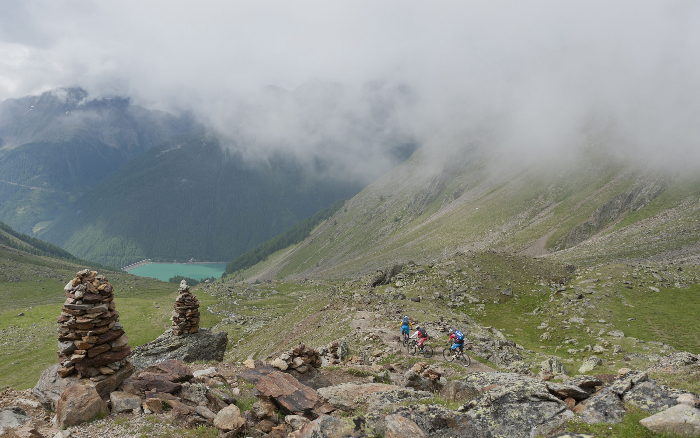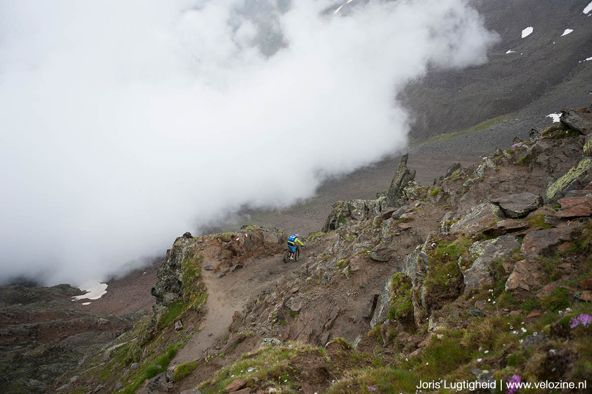 De afdaling van de Similaunhütte naar het Vernago-stuwmeer is pittig. Wat heet! Het is een van de lastigste, meest extreme afdalingen die ik tot nu toe gereden heb. Niet alleen omdat het terrein uiterst technisch is, maar ook vanwege de natte ondergrond en de dikke mist. Maar het is ook spectaculair. Vanwege de regen, de mist en het rauwe, stenige landschap lijkt het alsof we op een andere planeet zijn.
