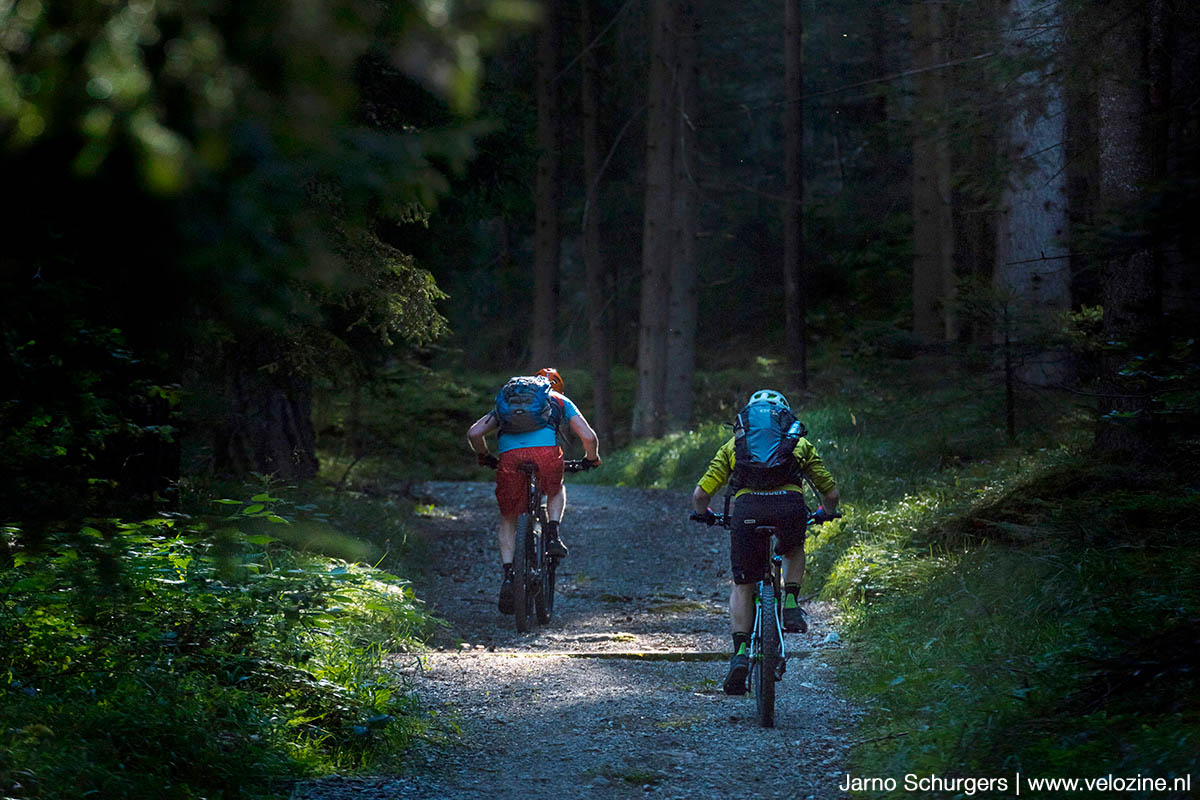 De eerste toer gaat naar de top van de Miederer Berg, een 1.600 meter hoge bult aan de noordoostkant van het dal. De eerste meters rollen we nog door bebouwing, maar al snel verruilen we de geasfalteerde weg voor een schotterstraße door een dicht bos. Mooi, maar steil. Zo vers uit polder is het – als altijd – weer flink wennen aan de hoogte. Gelukkig draait Robert na een kleine honderd hoogtemeters een smal, met dennennaalden bedenkt pad in, dat afwisselend stijgend en dalend heerlijk gelijkmatig de hoogtelijn blijft volgen. Yes! Dit is mountainbiken op z’n best! Snel, actief en spannend, maar niet té spannend.