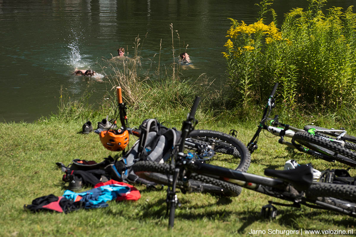 Omlaag pakken we natuurlijk niét de gondel. Robert weet namelijk een spannend paadje terug naar Neustift. “Of rijden jullie liever de schotterstraße omlaag?”. Tja, wat denkt-ie nou, deze berggeit? Dat we als laaglanders niet van afdalen houden? En dus knallen we enthousiast achter onze gastvrije gids aan. De eerste driehonderd meter zijn vanwege de vele wortels, keien en modder nogal sketchy, maar dan gaat het pad het bos in en begint het feest. Over een glad, met dempende dennennaalden bedekt pad rollen we de Miederer Berg af, totdat we bij hetzelfde bergbeekje belanden als op de heenweg. Als we dat overgestoken zijn rollen we het pad van eerder vanmorgen in omgekeerde richting weer af. Weer in het dal rijden we een klein stukje om voor een verfrissende duik in de Kampler See. Lekker!