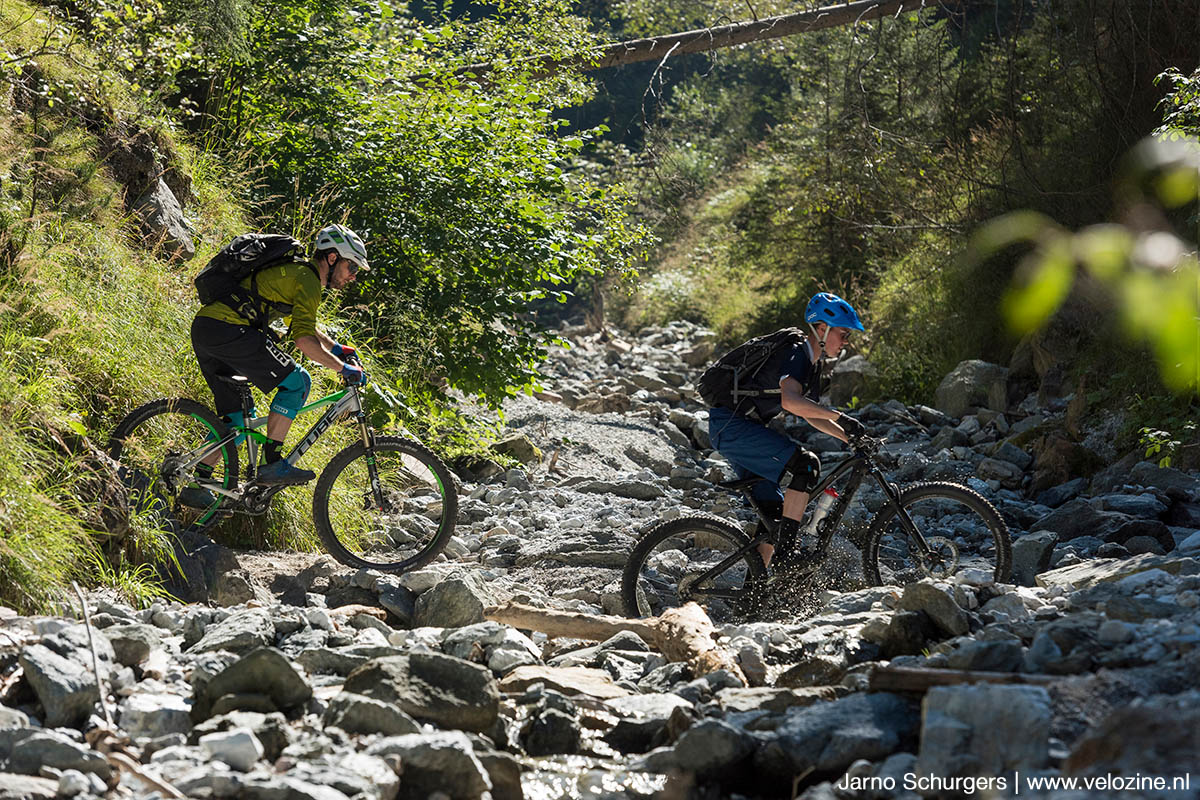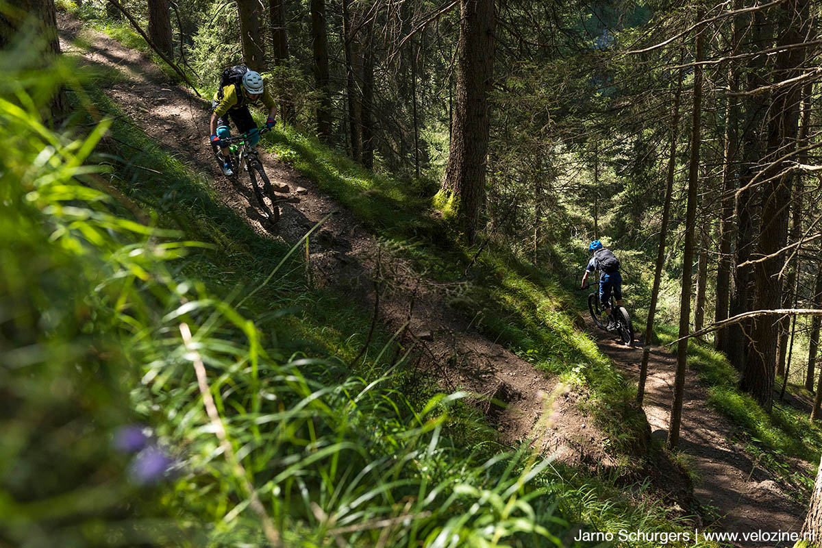 De middag heeft Robert ingepland om ons de trails op de flanken van de Elferspitze te laten zien. EinsEinser Trail heet die route, naar de naam van de berg waarop-ie ligt: de 2.505 meter hoge Elferspitze. De EinsEinser Trail is bijna vijf kilometer lang en daalt zo’n 800 hoogtemeters, vanaf het bergstation van de gondelbaan tot in het dal. Parallel aan de EinsEinser loopt de nieuwe ZweiZweier. Net zo lang, maar volgens Robert meer flowy, zodat-ie toegankelijker is voor meer bikers. Omhoog fietsen via een grindweg kan prima, maar vanwege de zware enduro- en freeridebikes waarmee de locals deze route veelal pakken is de lift favoriet. En waarom ook niet, de uitbaters van de Elferbahn rekenen niets extra’s voor het meenemen van de bike. En dat hebben we in de Alpen nog maar weinig meegemaakt. Goed geregeld!